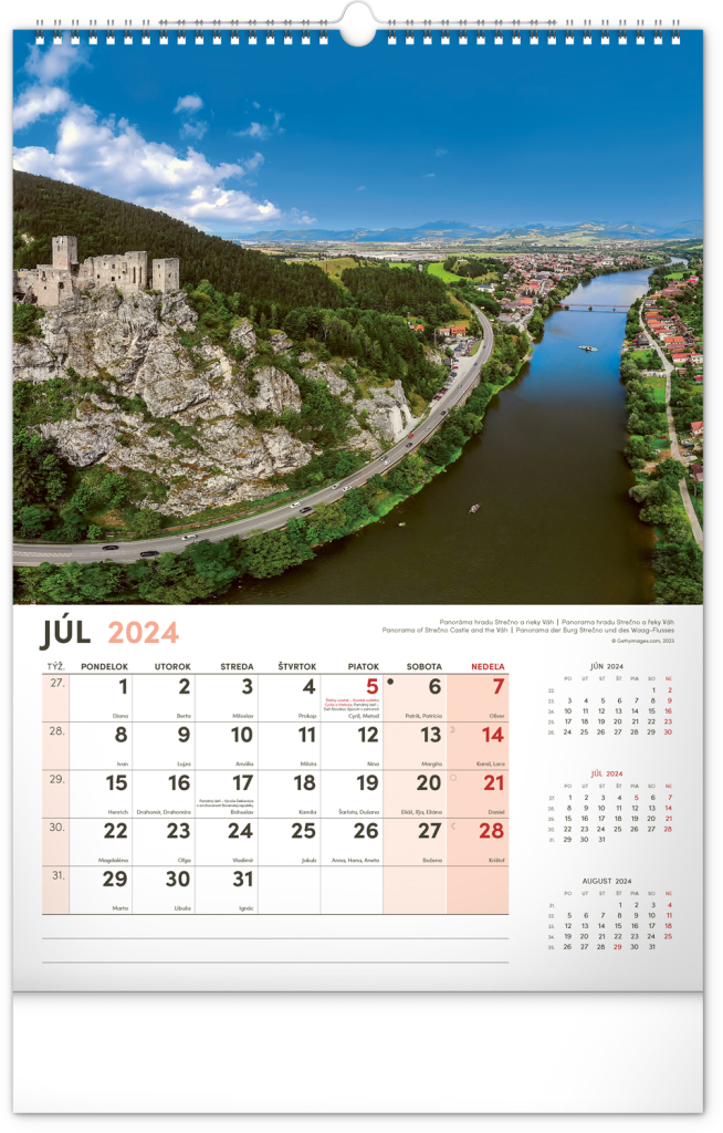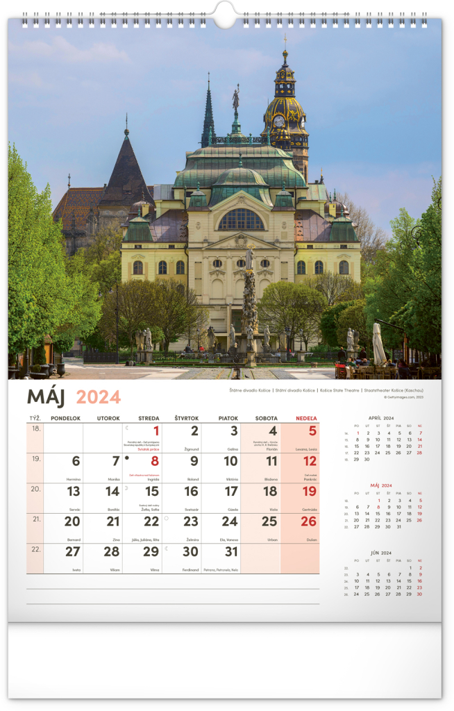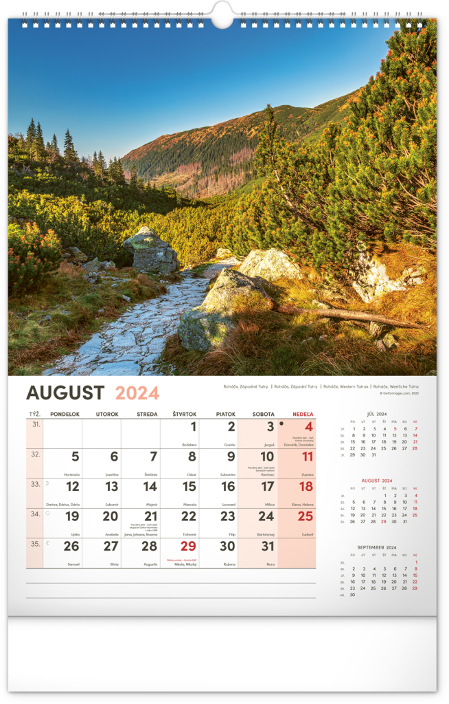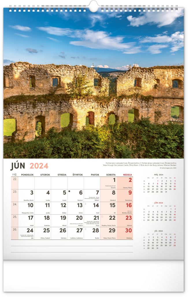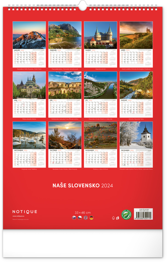 Kalendář obsahuje fotografie architektonických i přírodních památek z celého Slovenska. Kalendář výškového formátu obsahuje slovenské kalendárium se jmény, svátky, fázemi měsíce a tříměsíčním přehledem na každý měsíc. S prostorem na poznámky.