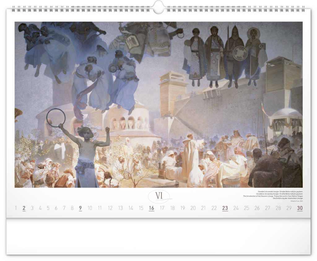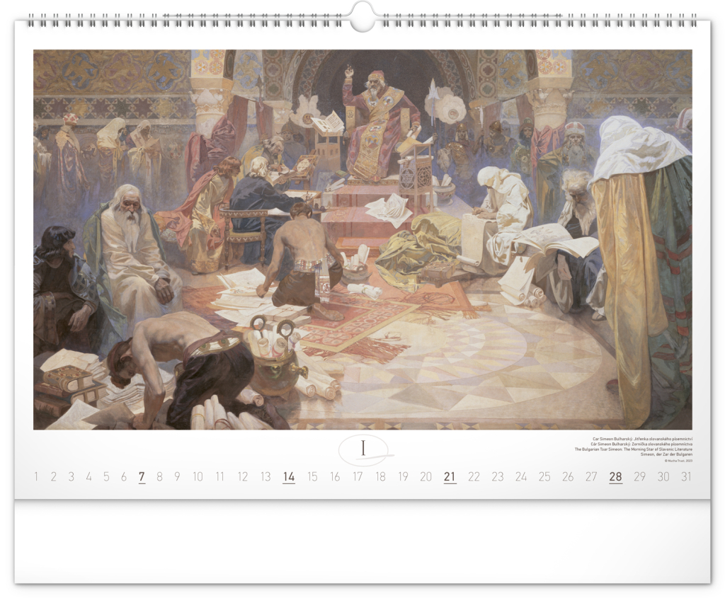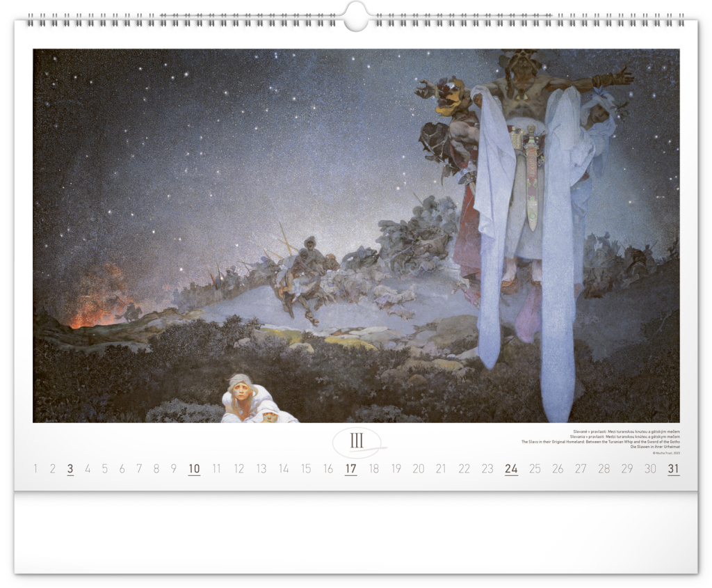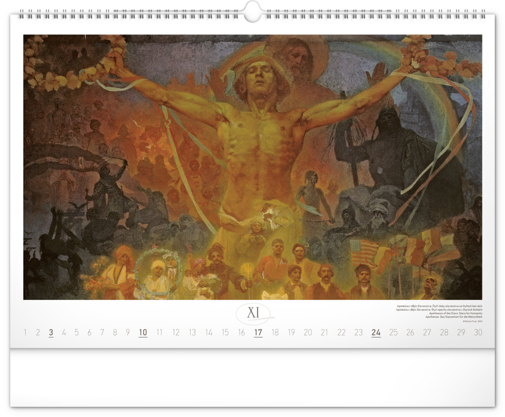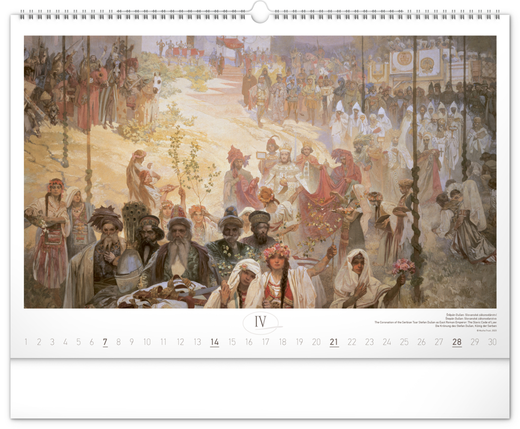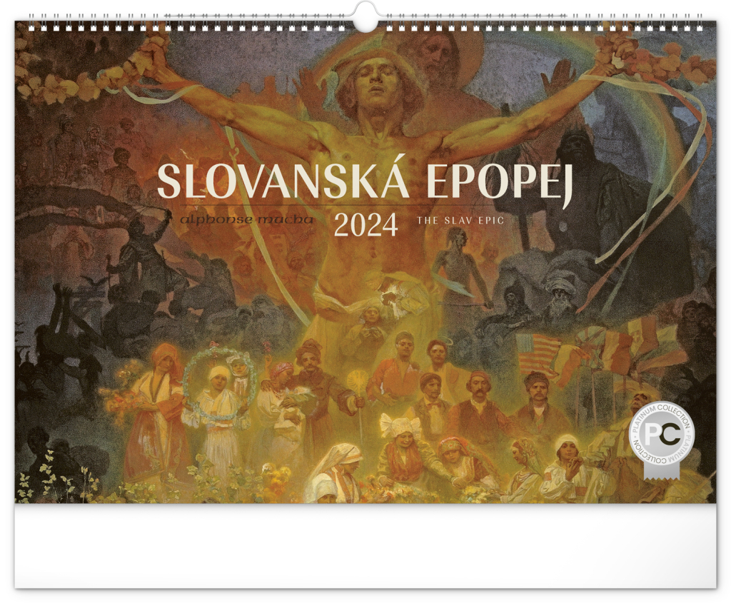 Nástěnný kalendář s reprodukcemi známých obrazů Slovanské epopeje od českého secesního malíře Alfonse Muchy. Reprodukce epopeje doplňuje vkusné univerzální kalendárium s vyznačenými nedělemi a popisky obrazů ve čtyřech jazycích (CZ, SK, EN, DE).