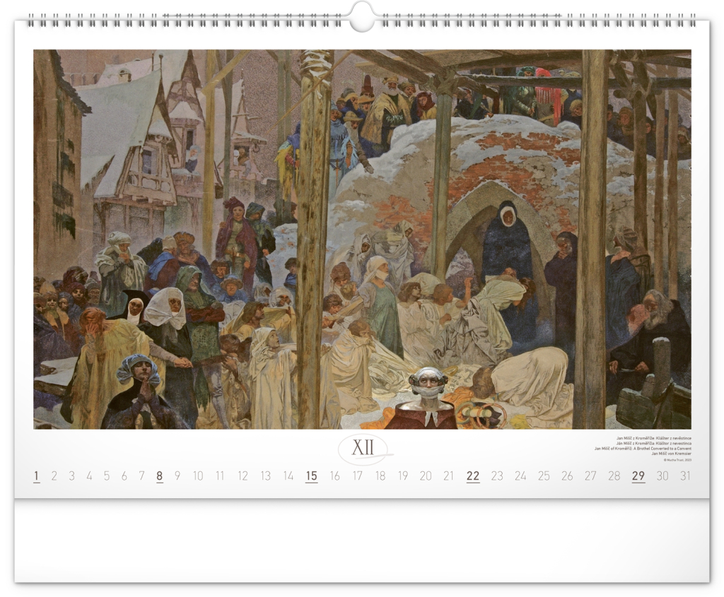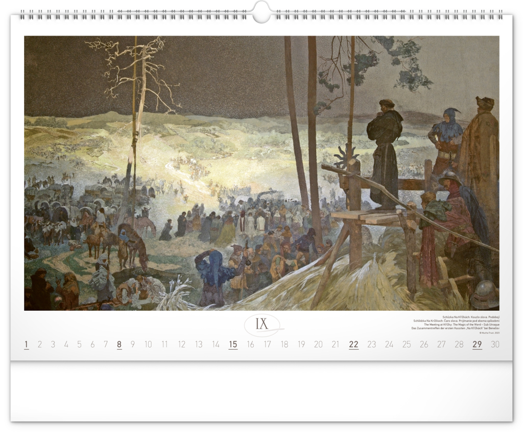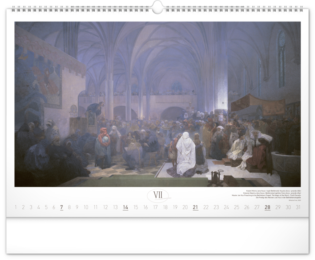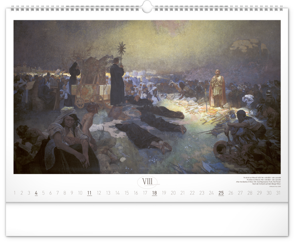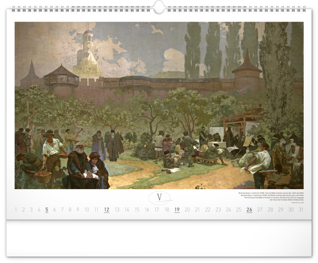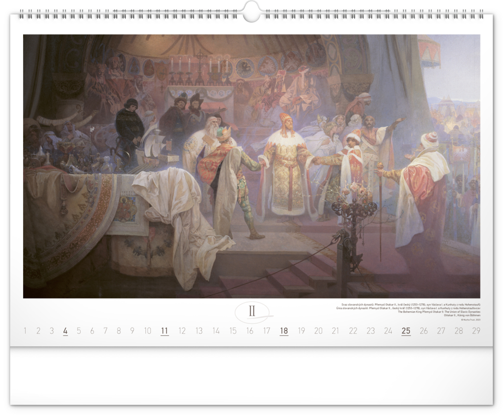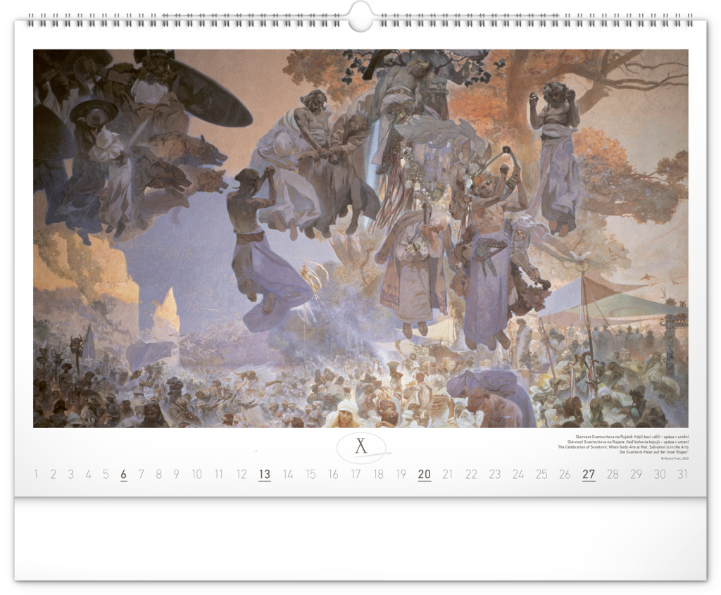 Nástěnný kalendář s reprodukcemi známých obrazů Slovanské epopeje od českého secesního malíře Alfonse Muchy. Reprodukce epopeje doplňuje vkusné univerzální kalendárium s vyznačenými nedělemi a popisky obrazů ve čtyřech jazycích (CZ, SK, EN, DE).