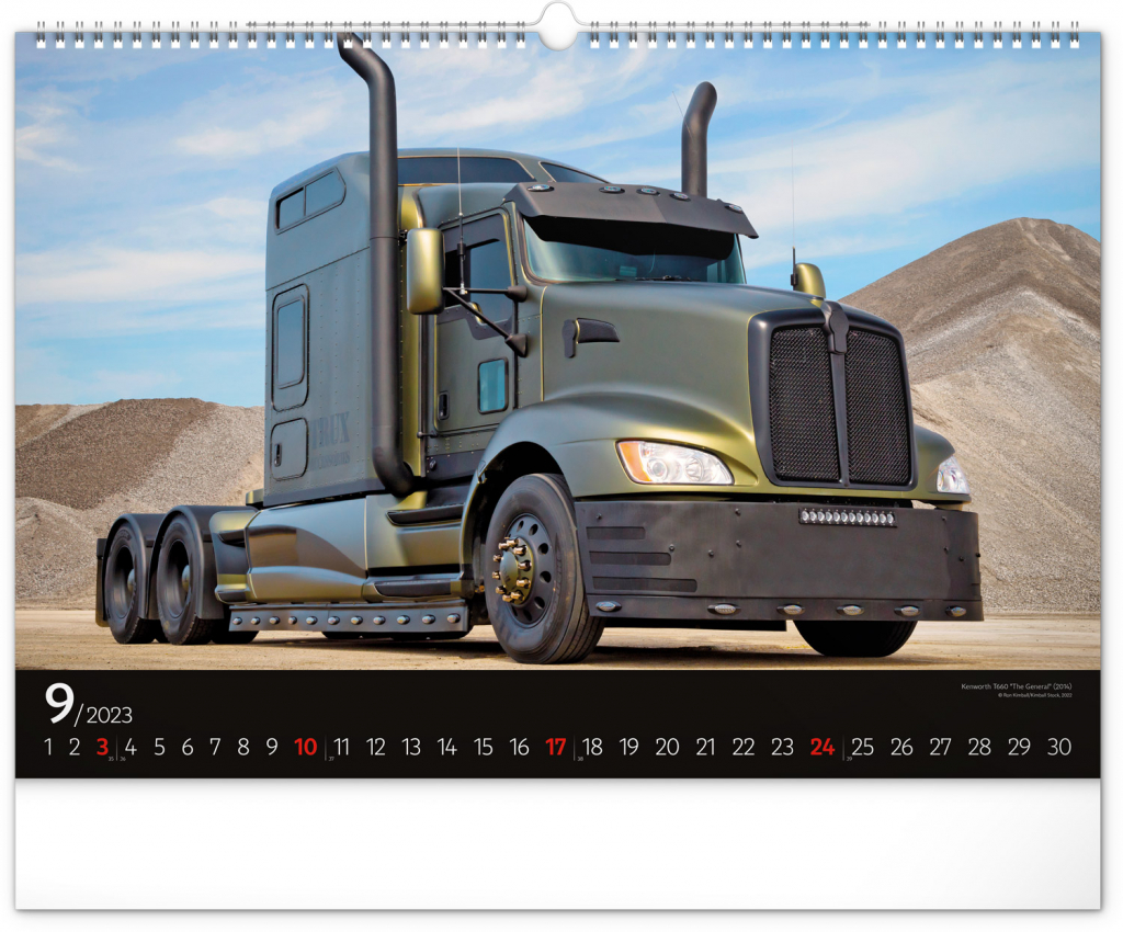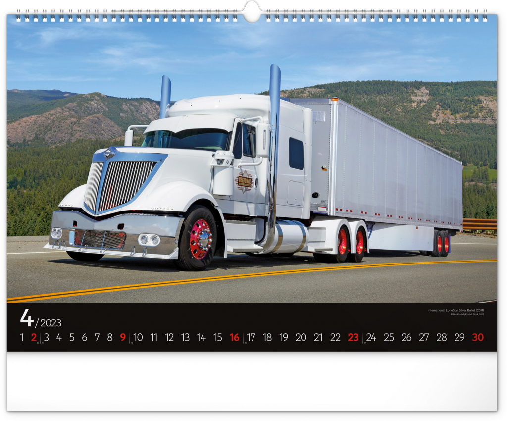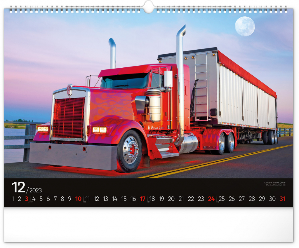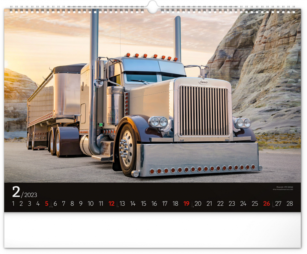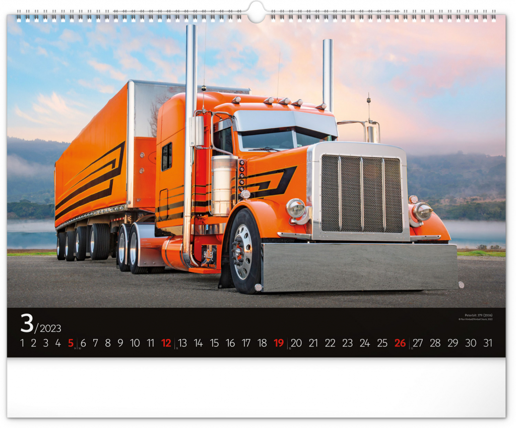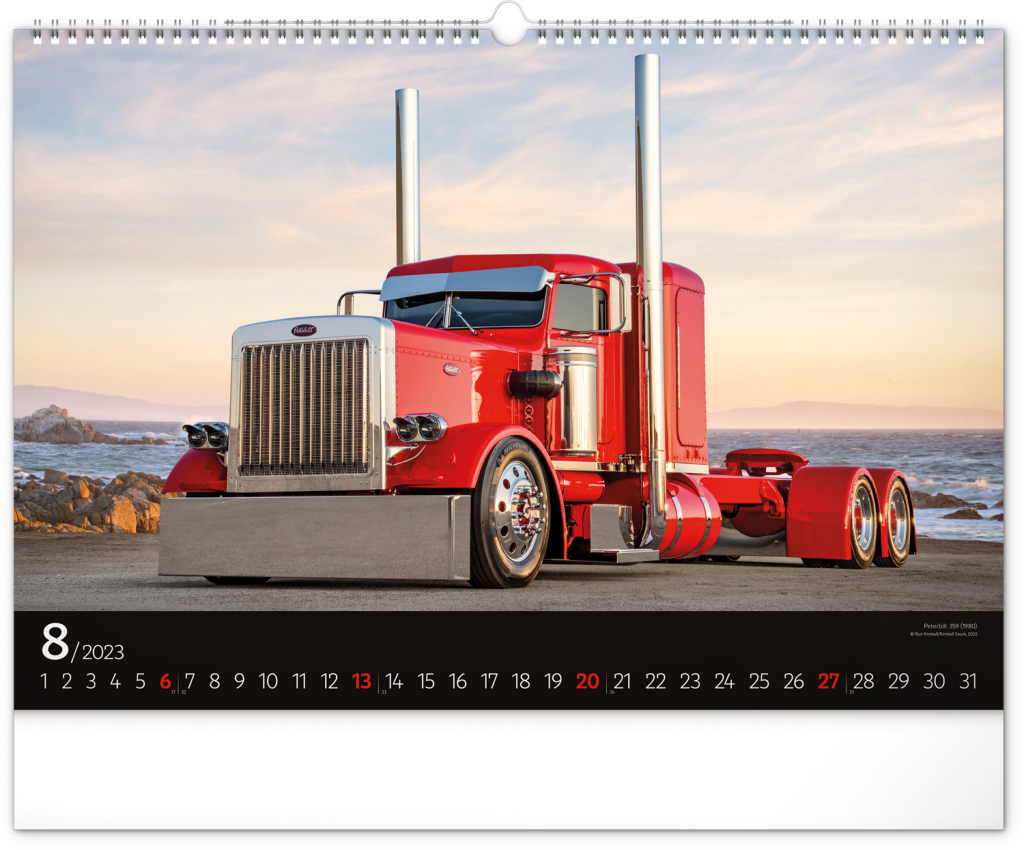 Nástěnný kalendář s atraktivními snímky amerických tahačů pro všechny fanoušky „trucků“. Dvanáct snímků „králů amerických silnic“ na stránkách kalendáře v šířkovém formátu s univerzálním kalendáriem na černém pozadí.