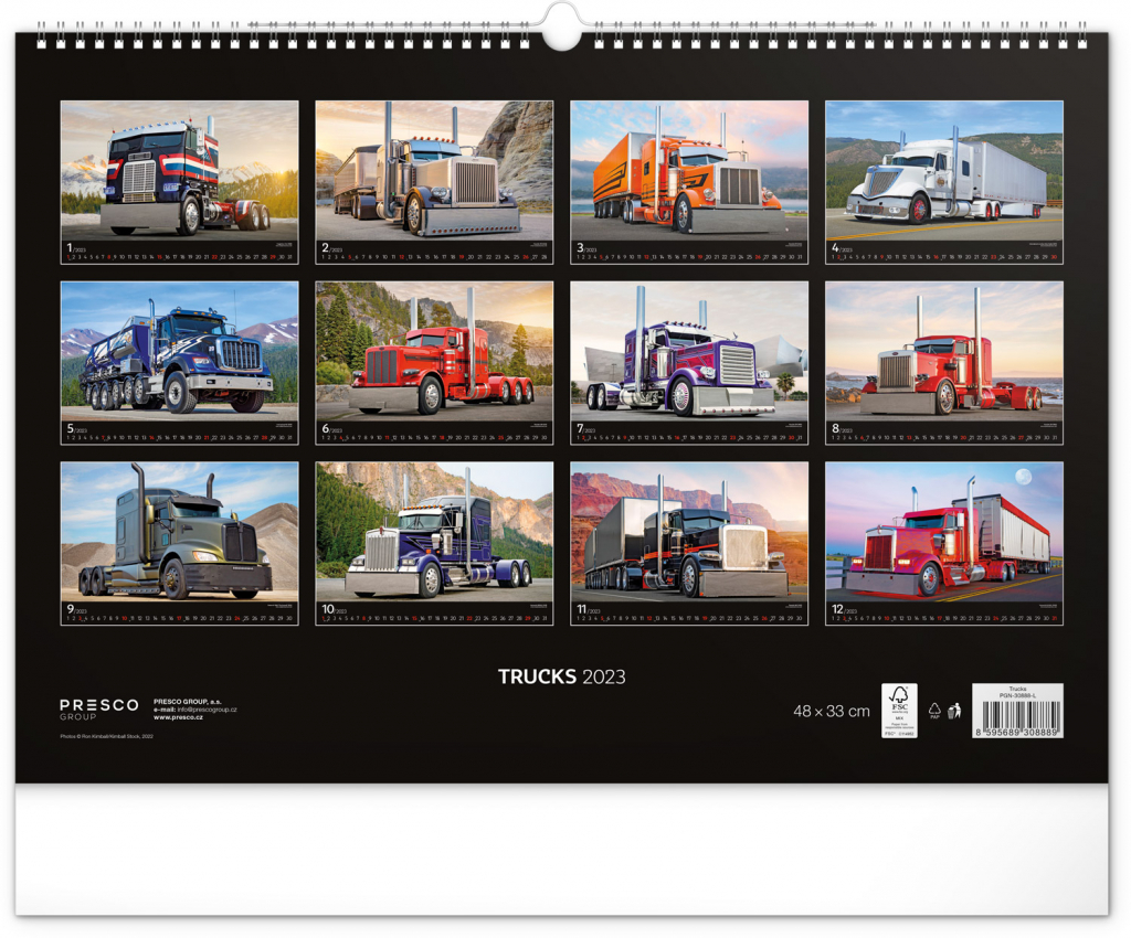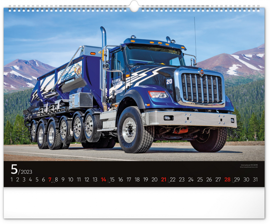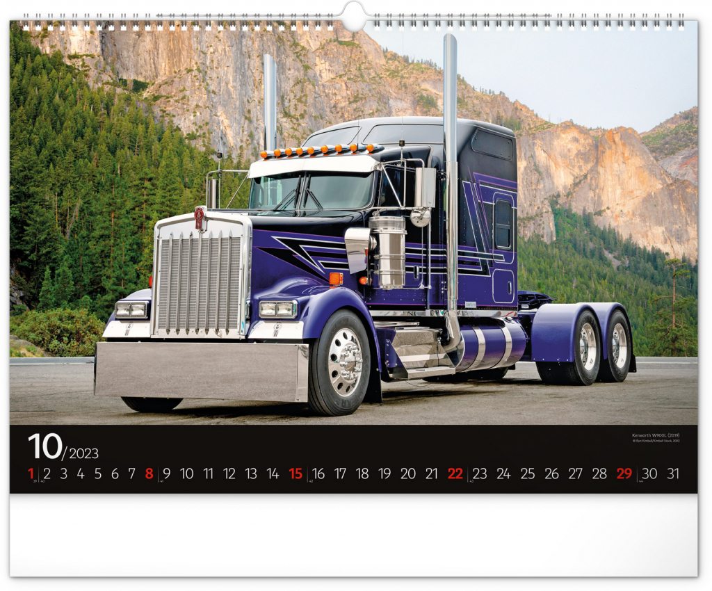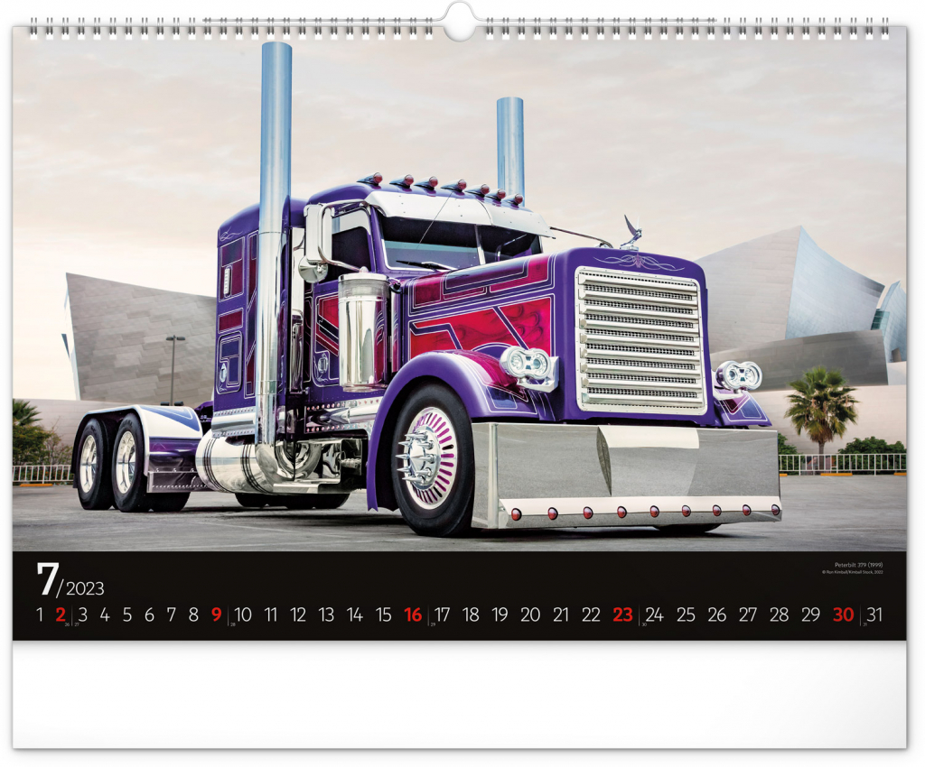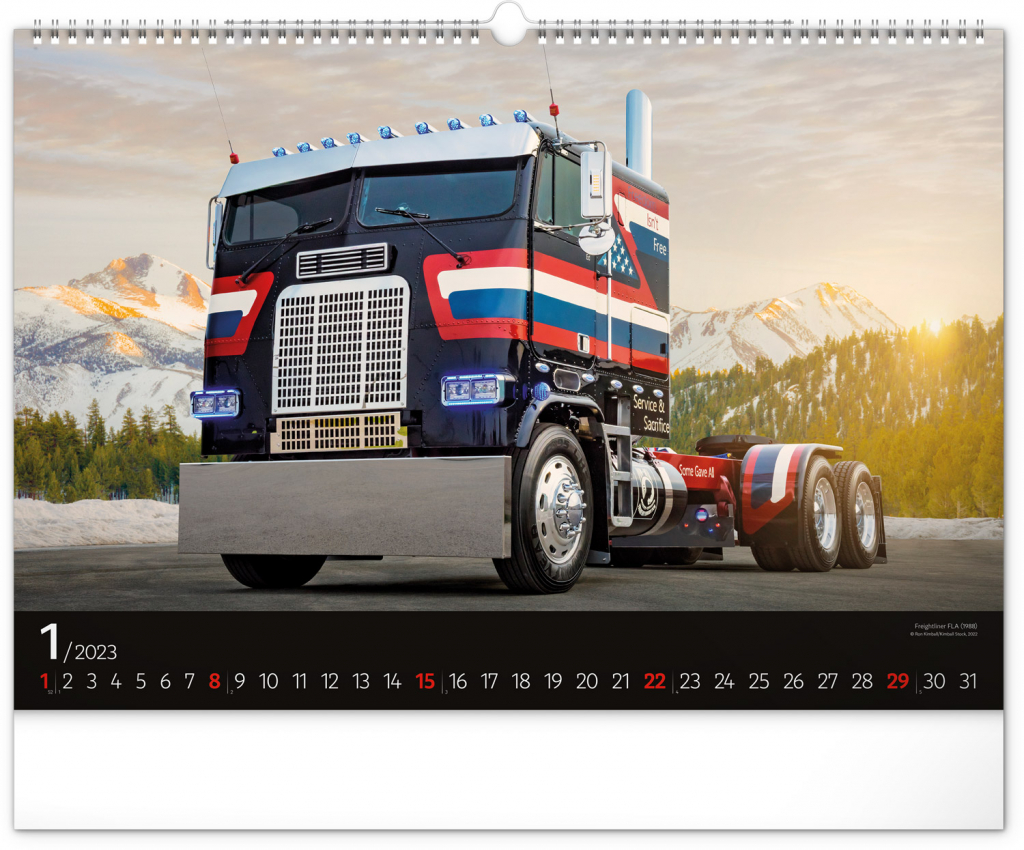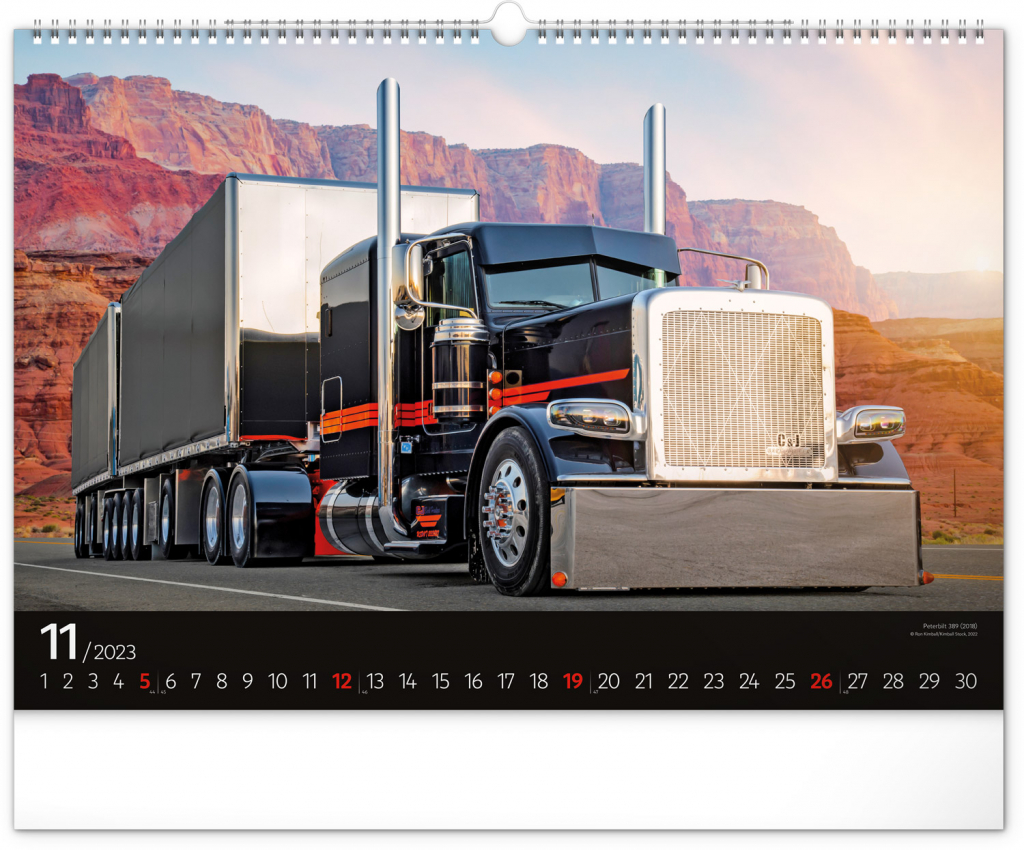 Nástěnný kalendář s atraktivními snímky amerických tahačů pro všechny fanoušky „trucků“. Dvanáct snímků „králů amerických silnic“ na stránkách kalendáře v šířkovém formátu s univerzálním kalendáriem na černém pozadí.