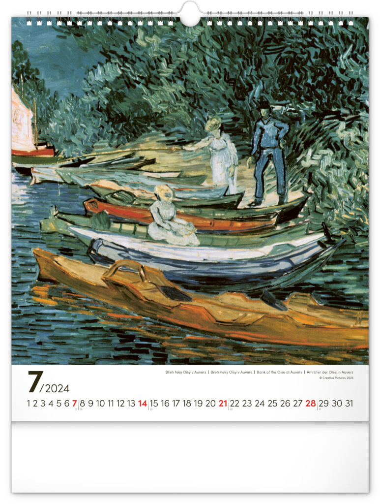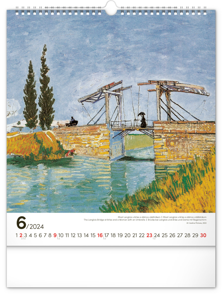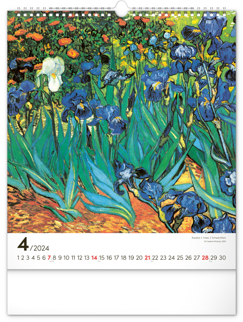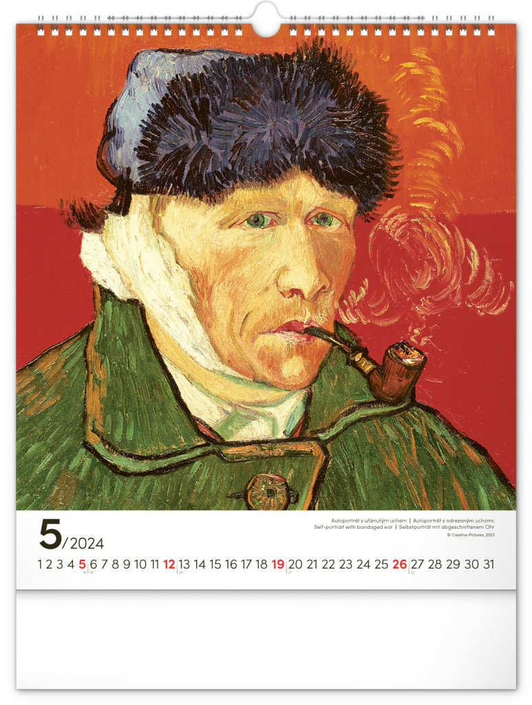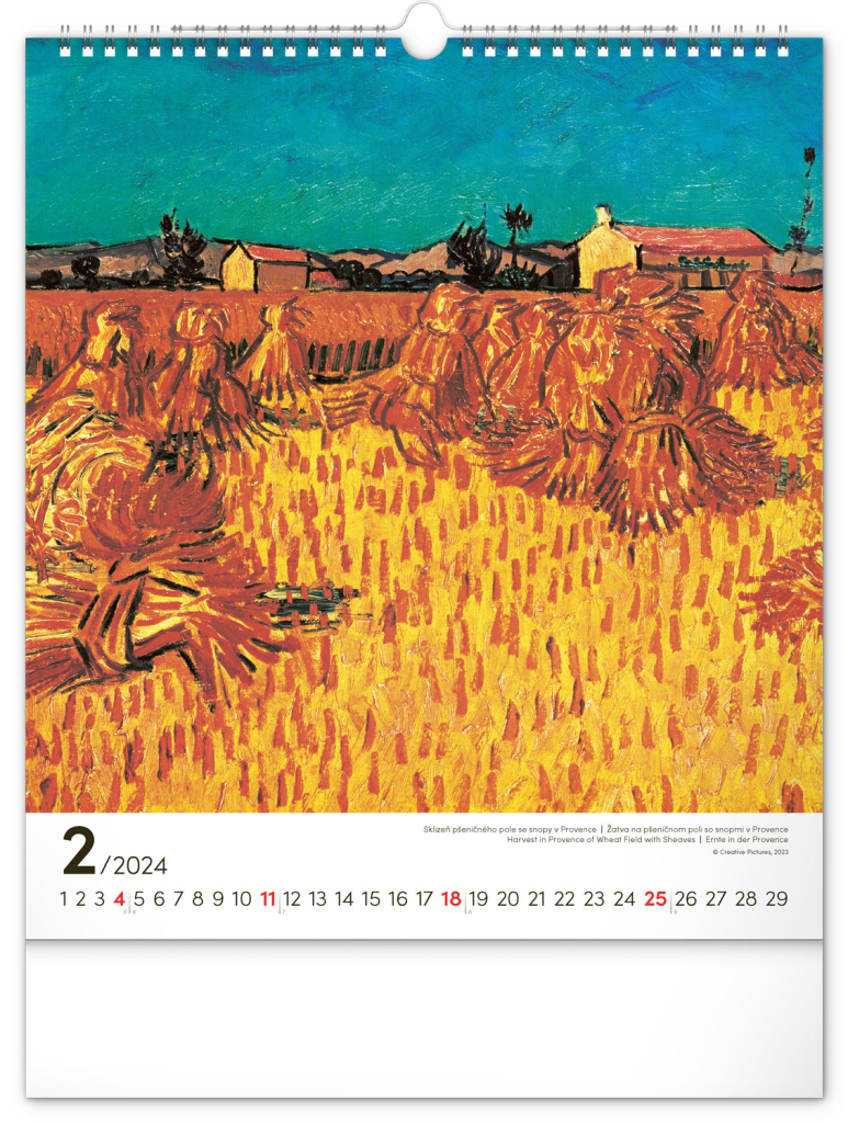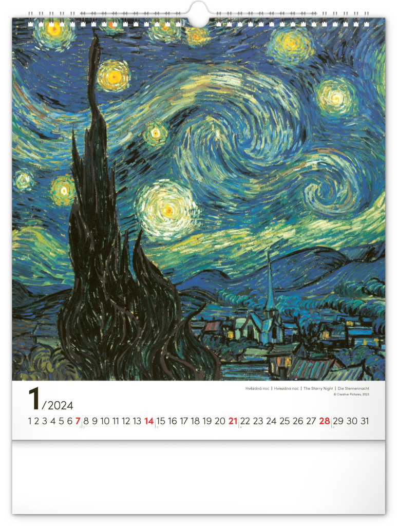 Na stranách kalendáře v obdélníkovém formátu naleznete nejznámější van Goghova díla vytištěná na kvalitním papíře s vysokou gramáží. Kalendář obsahuje univerzální kalendárium a popisky ve čtyřech jazycích.