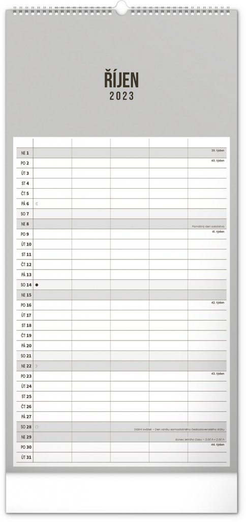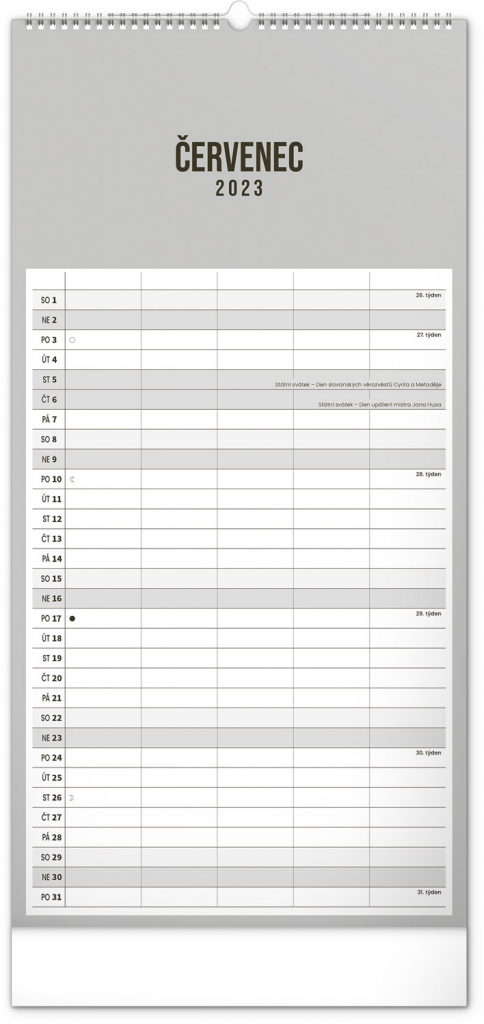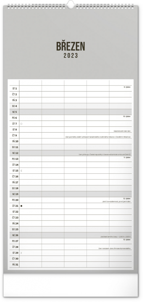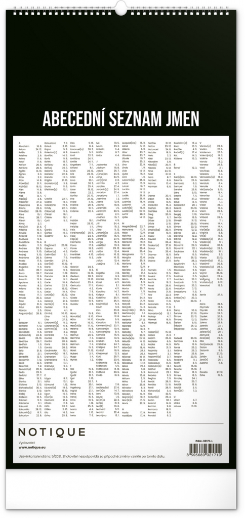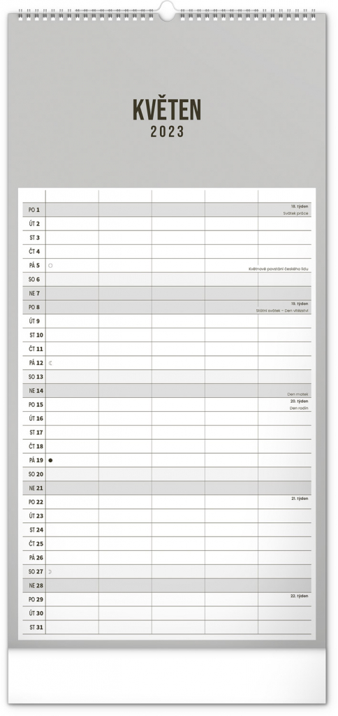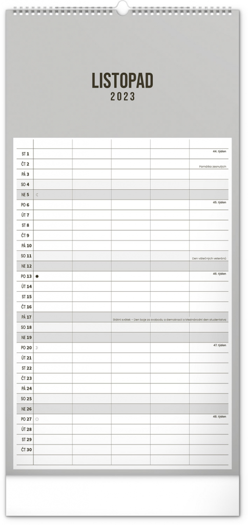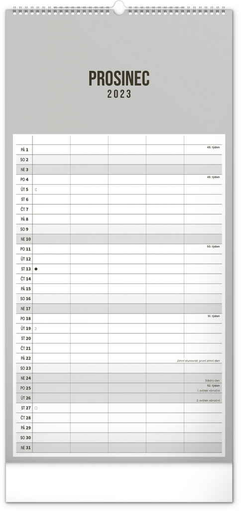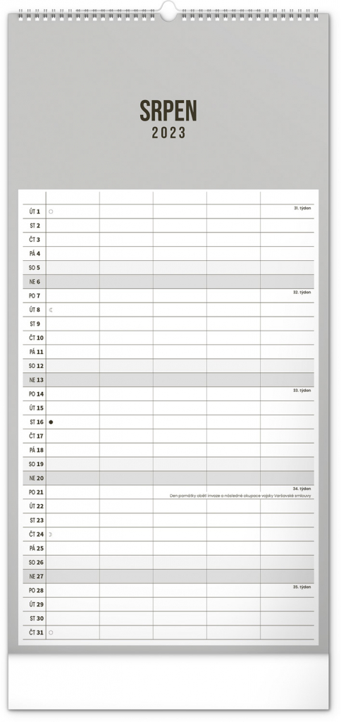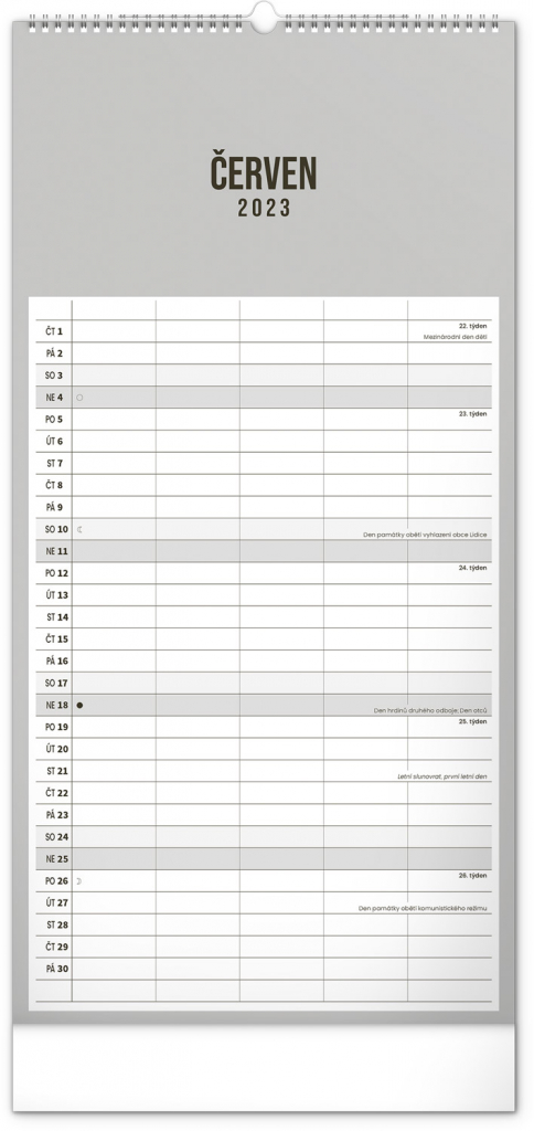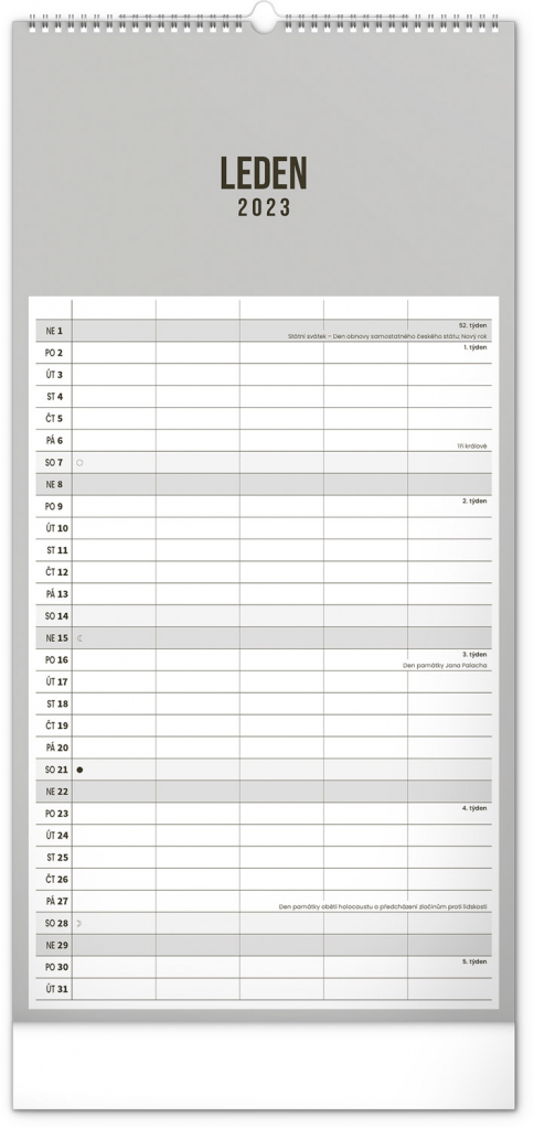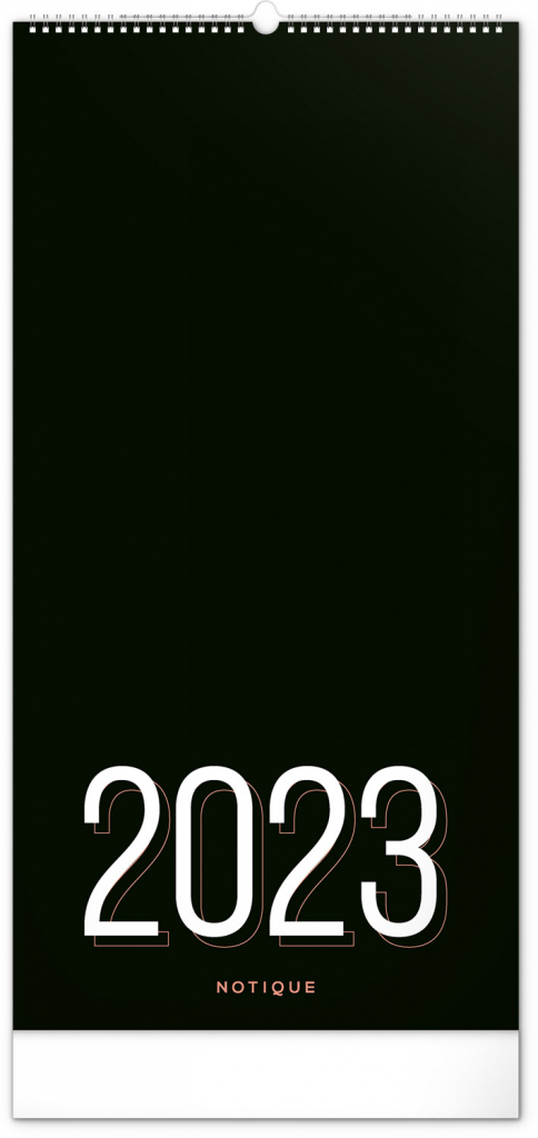 Minimalistický nástěnný kalendář v elegantním černém provedení a se spirálovou vazbou. Obsahuje řádkové měsíční plánovací kalendárium s českými svátky a významnými dny. Každý den poskytuje dost místa pro plánování. Jako bonus v kalendáři najdete i abecední seznam českých jmen.
