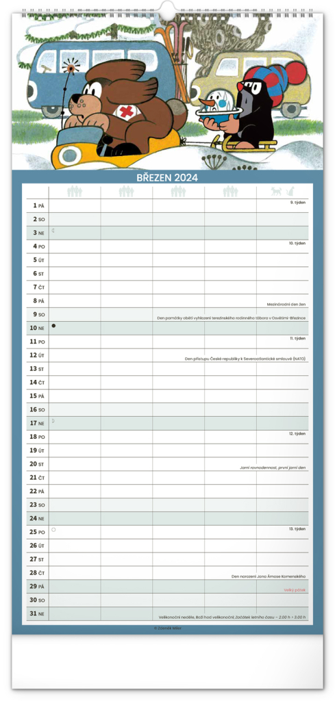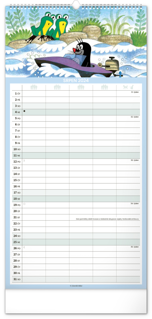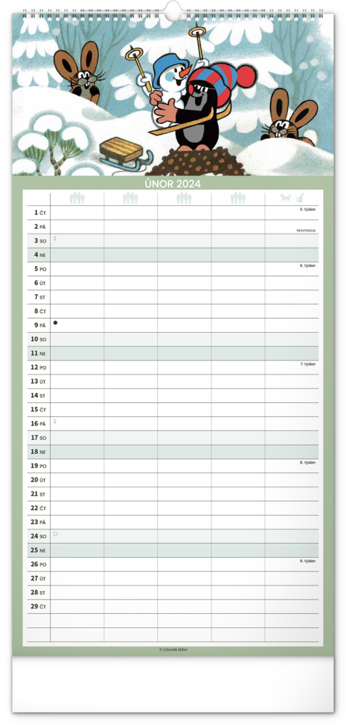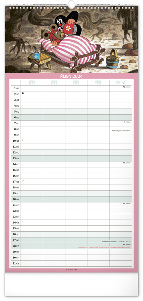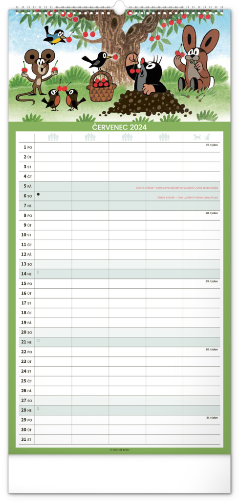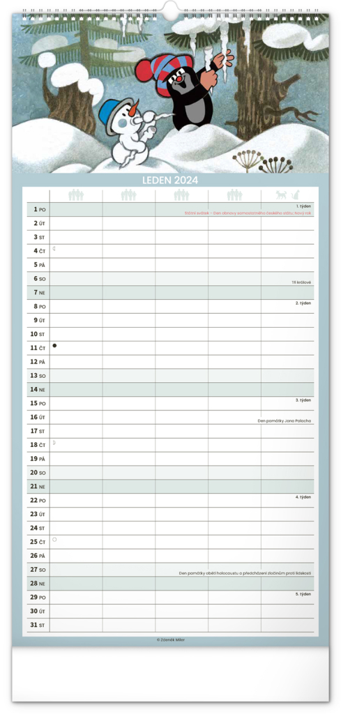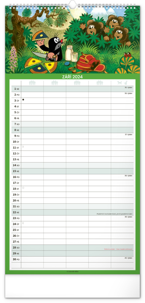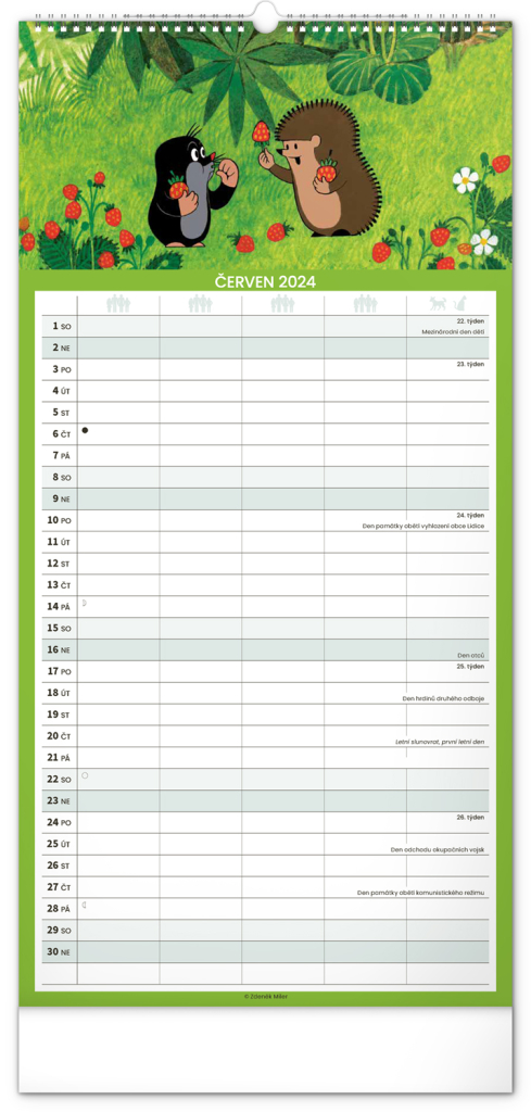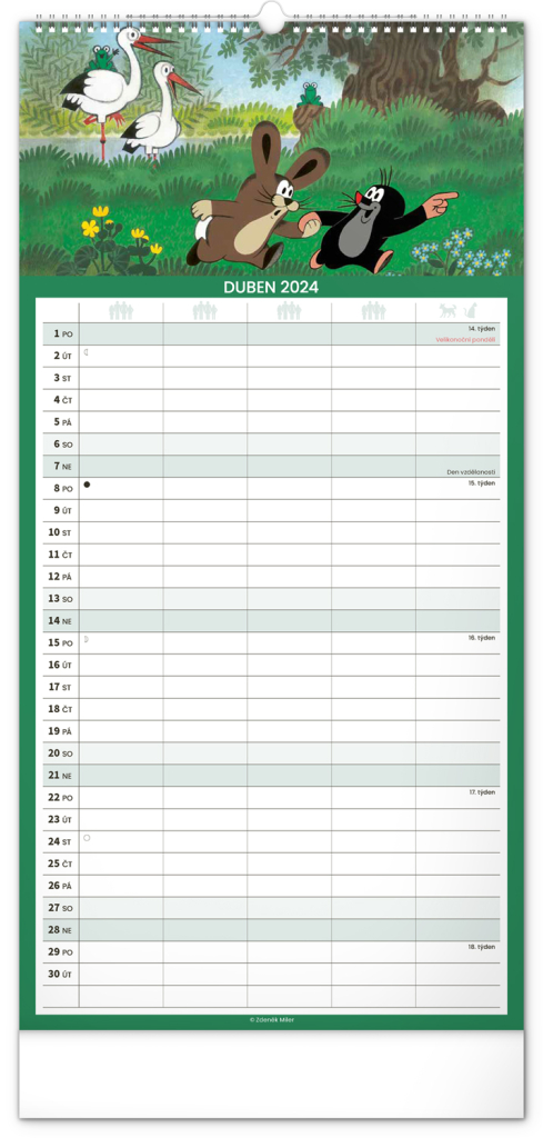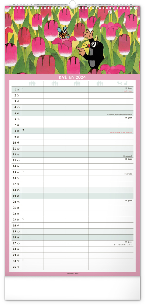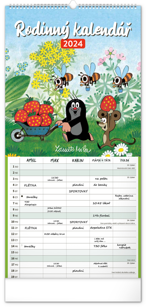 Krteček a jeho kamarádi ve formátu rodinného plánovacího kalendáře. České kelandárium a samostatný plánovač aktivit až pro pět členů domáctnosti s dostečným prostorem pro poznámky.