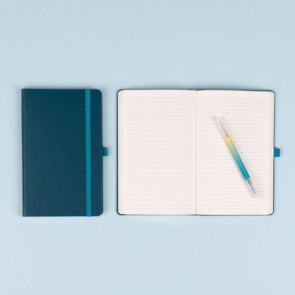 Praktický a lehký linkovaný notes v trendy tyrkysové barvě má povrch s jemnou strukturou, na který si můžete nechat vyrazit logo společnosti. Notes má pevnou knižní vazbu a zakulacené rohy, poutko na tužku, elastickou gumičku a textilní záložku. Linky mají 6 mm a jsou na kvalitním žlutém papíře.