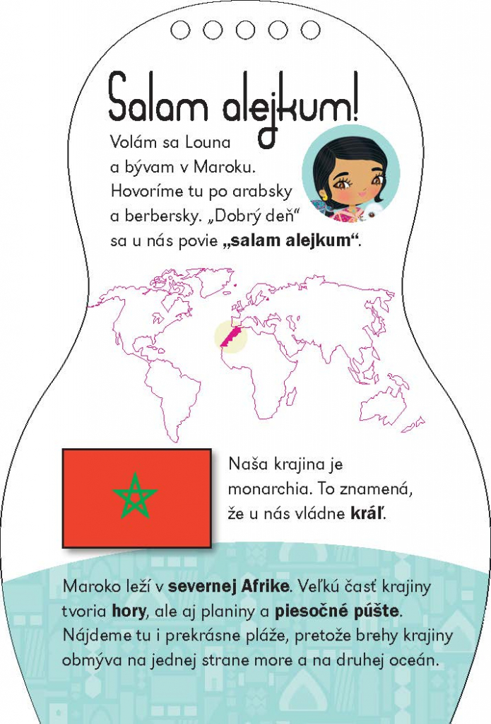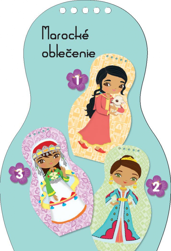 Další titul oblíbené série, která našla své obdivovatele již v téměř třiceti zemích světa, představuje malým čtenářům kouzlo Orientu prostřednictvím panenky Louny. Kreativní omalovánky, spousta samolepek… knížka obsahuje vše, co je třeba k vytvoření nesčetných modelů podle marocké módy. A k tomu se děti dočtou i spoustu zajímavých informací navrch! Jak se jejich vrstevníci v Maroku zdraví, jak se tam učí, na jakých specialitách si pochutnávají? Víte, co je to tažín nebo jak vypadá dželaba? To vše a ještě mnohem víc se dozvíte, vydáte-li se za poznáním s našimi panenkami. A ke každé knížce navíc dostanete krásný náramek pro štěstí!