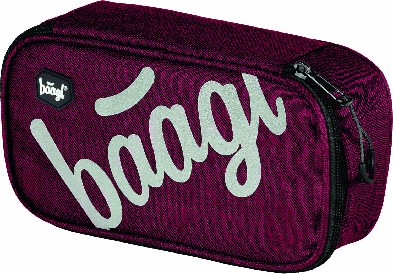 Vínový školní penál s reflexním logem BAAGL na přední straně. • Pevný penál na zip s dvojitou výklopnou chlopní. • Vnitřní kapsa na zip. • Kapsa se školním rozvrhem. • Logo Baagl je reflexní.
