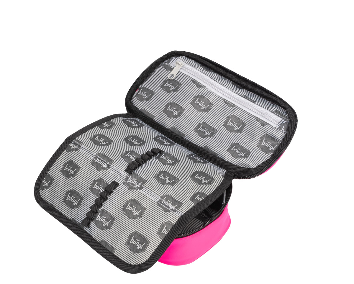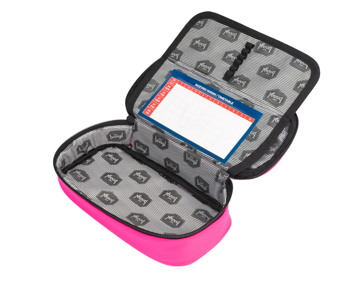 Dívčí pevný penál na zip s dvojitou výklopnou chlopní v růžové barvě z řady Skate! • Pevný penál na zip s dvojitou výklopnou chlopní v růžové barvě. • Vnitřní kapsa na zip. • Kapsa se školním rozvrhem.