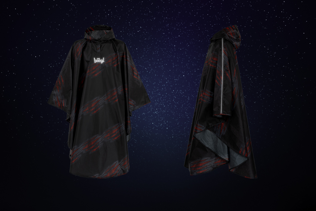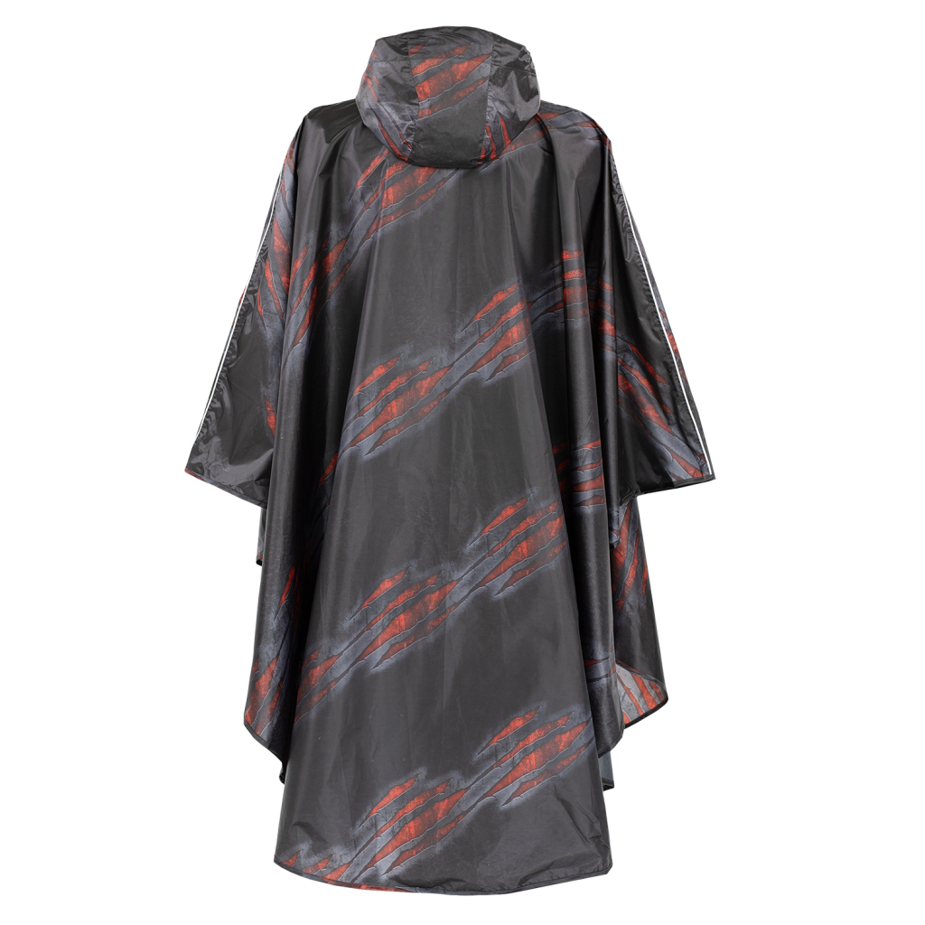 Praktická pláštěnka ve velikosti L s motivem lávy a kšiltovou kapucí. Díky promyšlenému střihu lze pláštěnku pohodlně nosit i přes batoh.