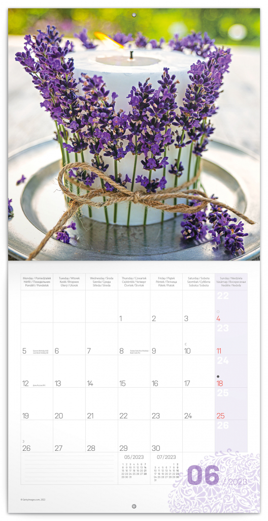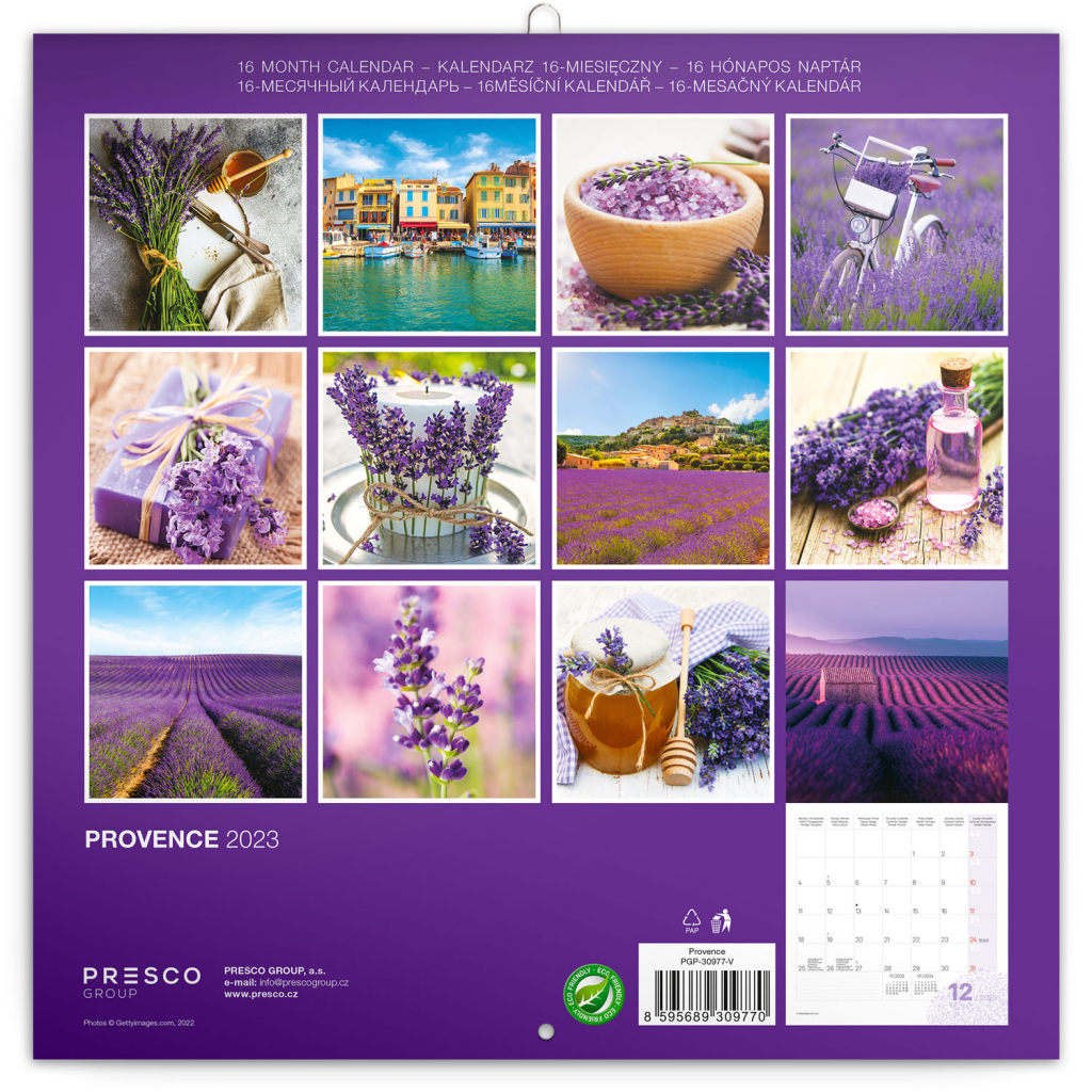 Provoňte si byt vůní levandule. Dvanáct fotografií z levandulí proslulé krajiny Provence v poznámkovém voňavém kalendáři. Obsahuje fáze měsíce, důležité svátky a prostor pro vaše poznámky a plány. Přetřete dlaní označená místa v kalendáři pro intenzivnější voňavý zážitek.