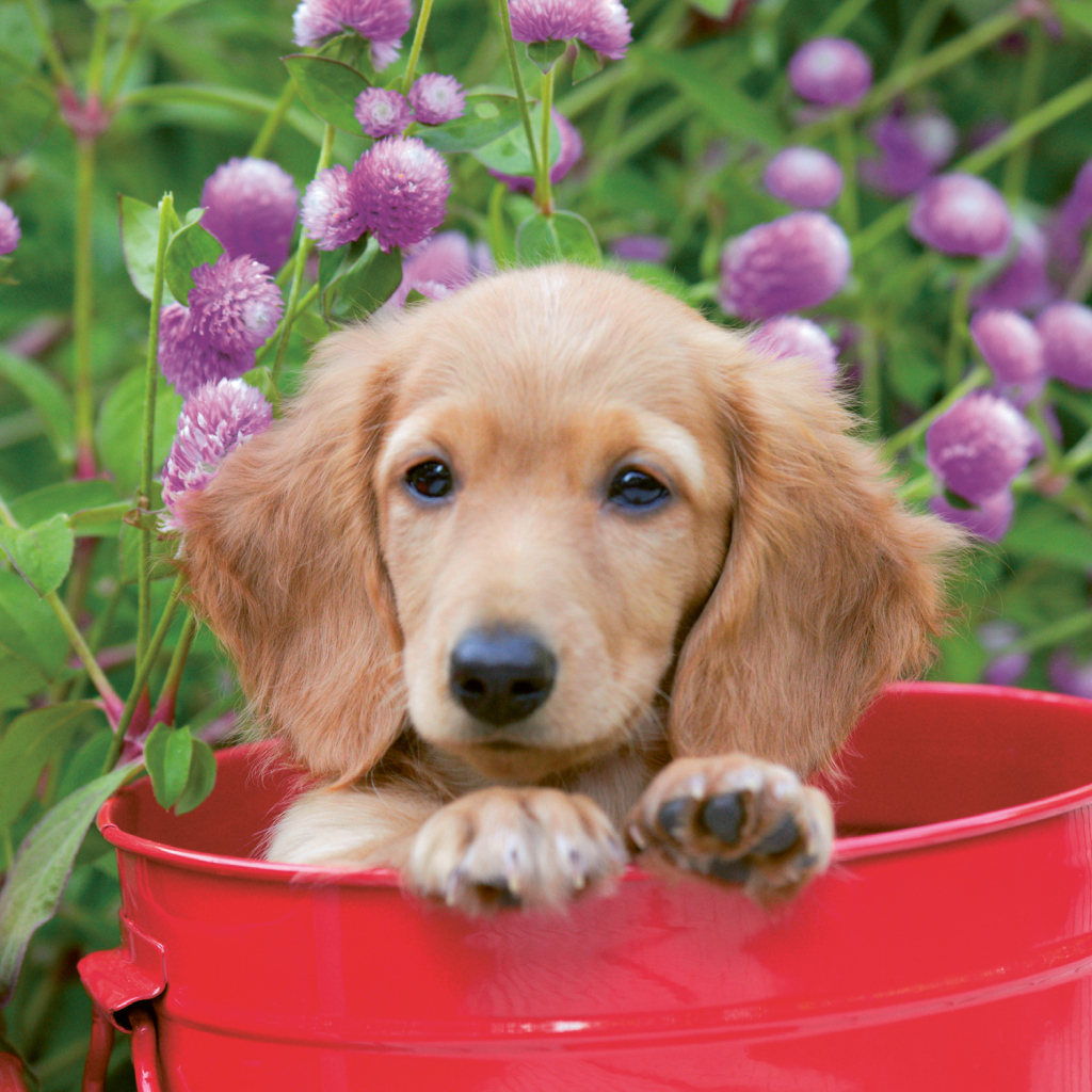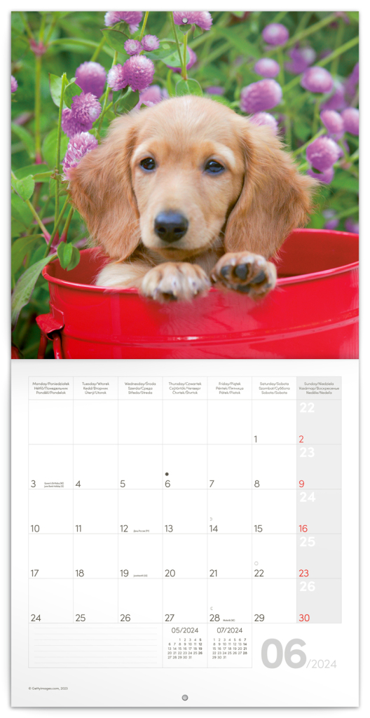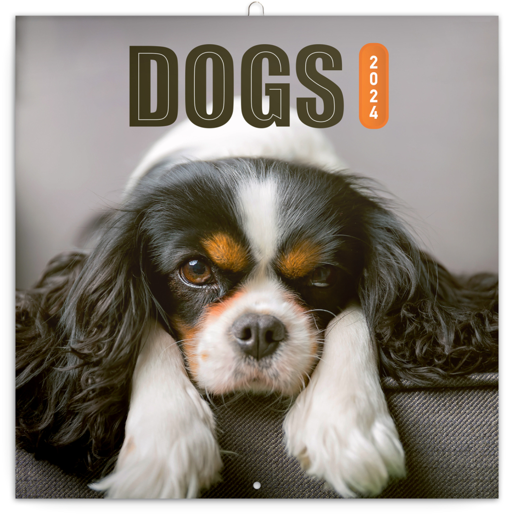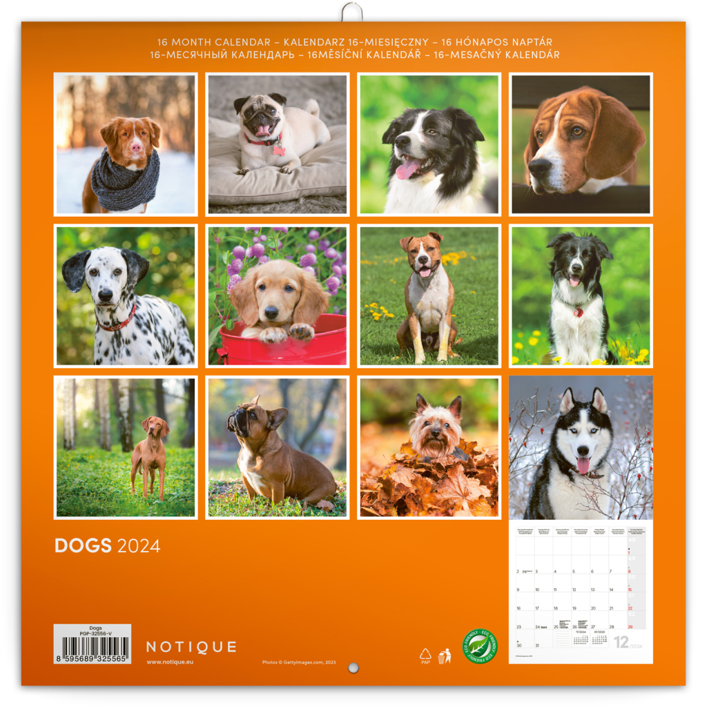 Psi, věrní čtyřnozí přátelé, v poznámkovém kalendáři. Uvnitř najdete přehledné kalendárium od září 2023 do prosince 2024 v šesti jazycích, fáze měsíce, důležité svátky a prostor pro poznámky na každý den.