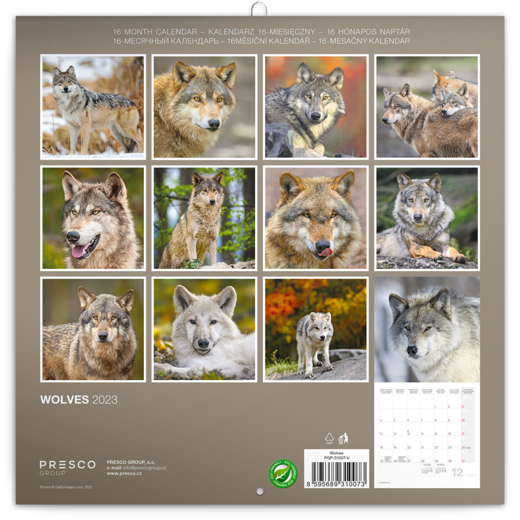 Dvanáct působivých fotografií vlků v poznámkovém kalendáři s šestijazyčným kalendáriem od září 2022 do prosince 2023. Kalendář obsahuje fáze měsíce, důležité svátky a prostor pro poznámky na každý den.