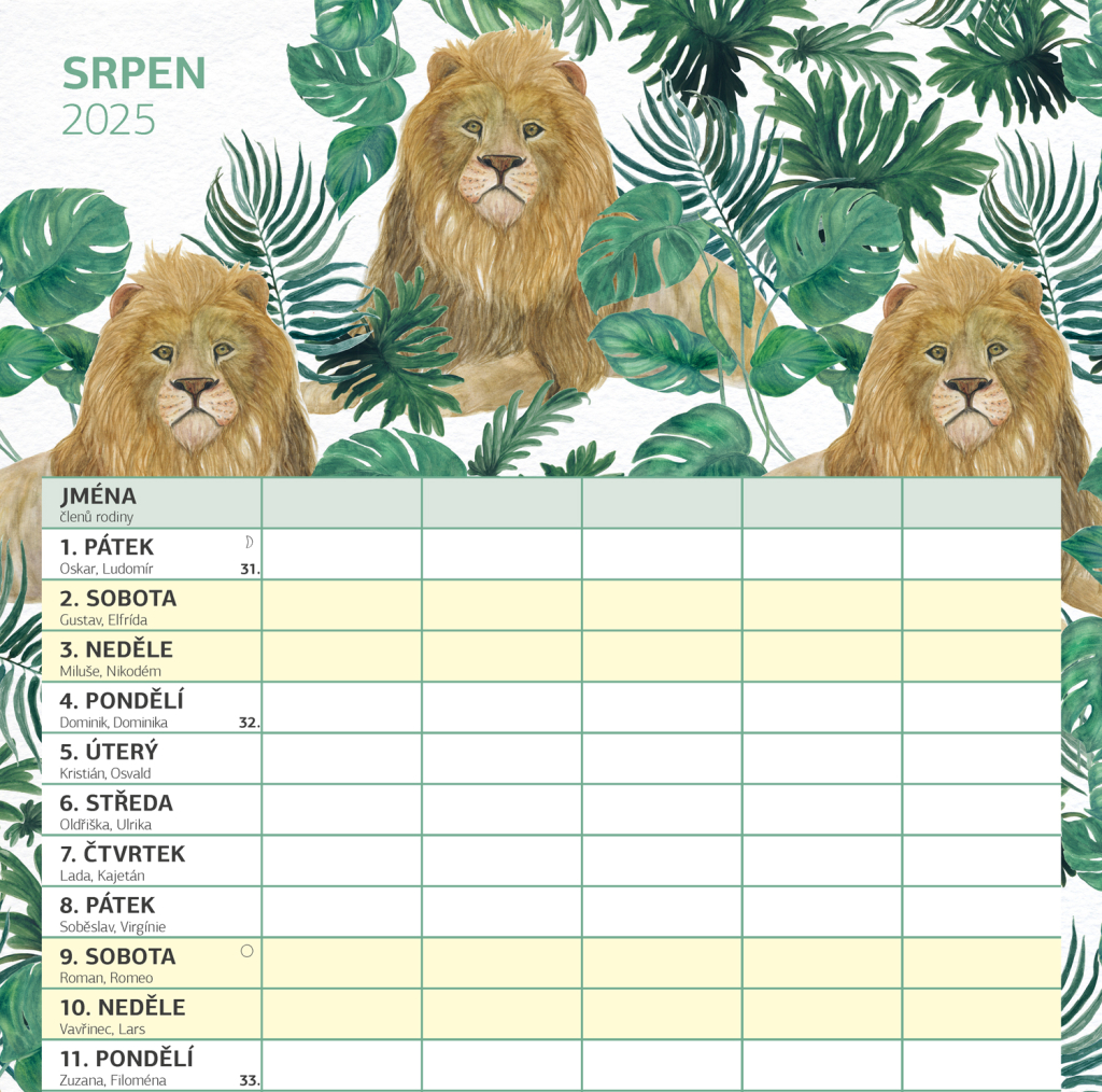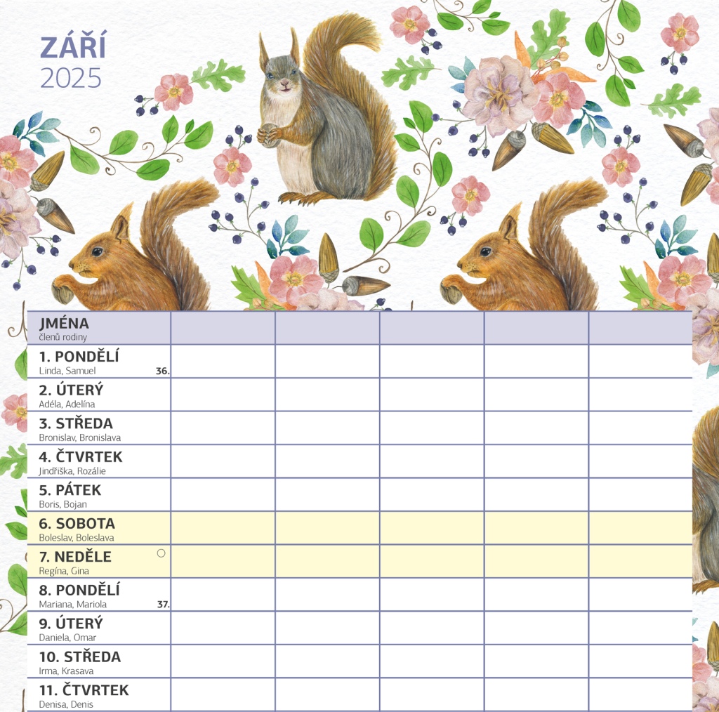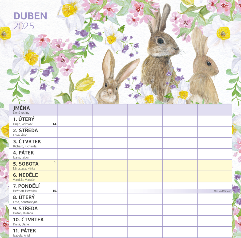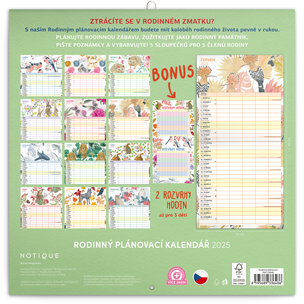 Zorganizujte všechny rodinné aktivity v praktickém nástěnném kalendáři, který obsahuje české kalendárium a samostatný plánovač aktivit pro až pět členů domácnosti. Kalendář doplňují veselé ilustrace s rodinnými motivy pro každé roční období.
