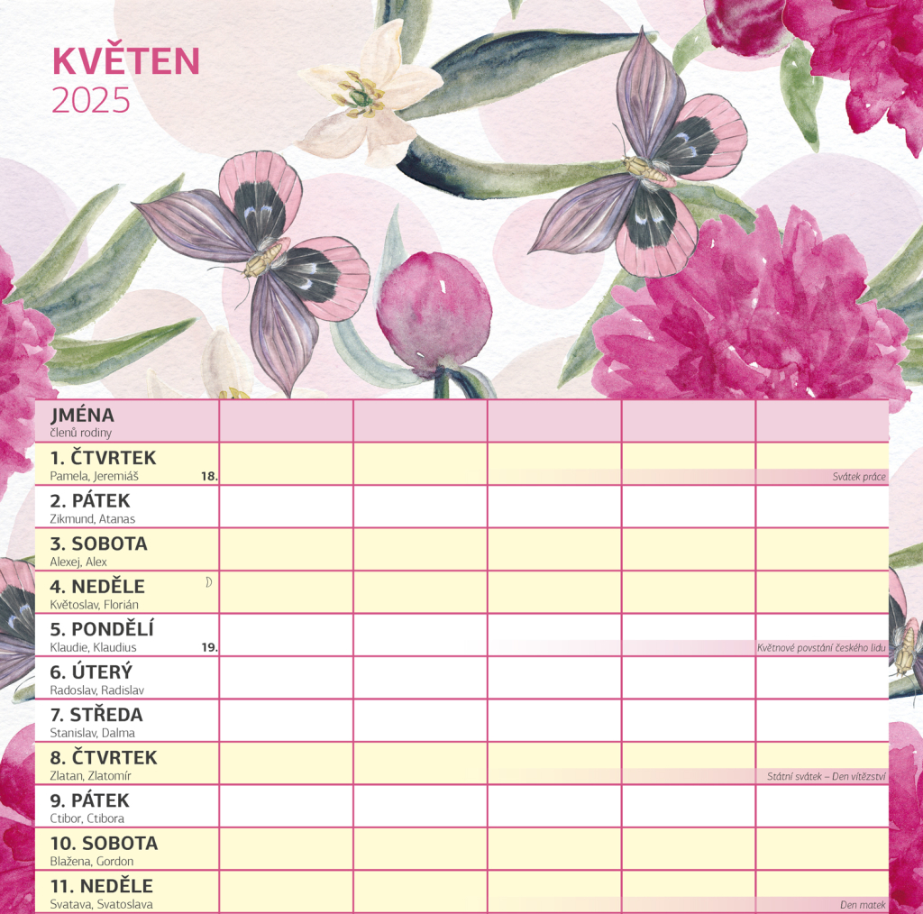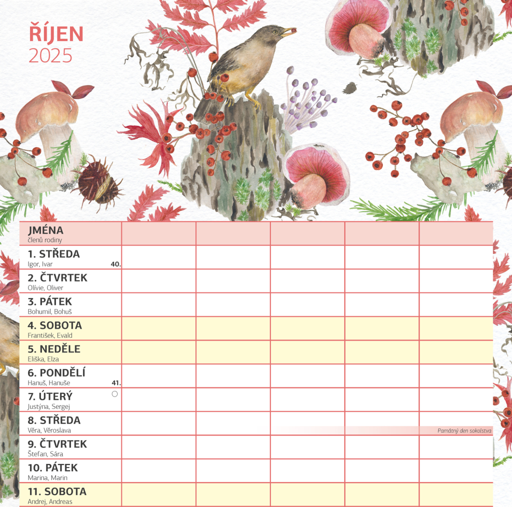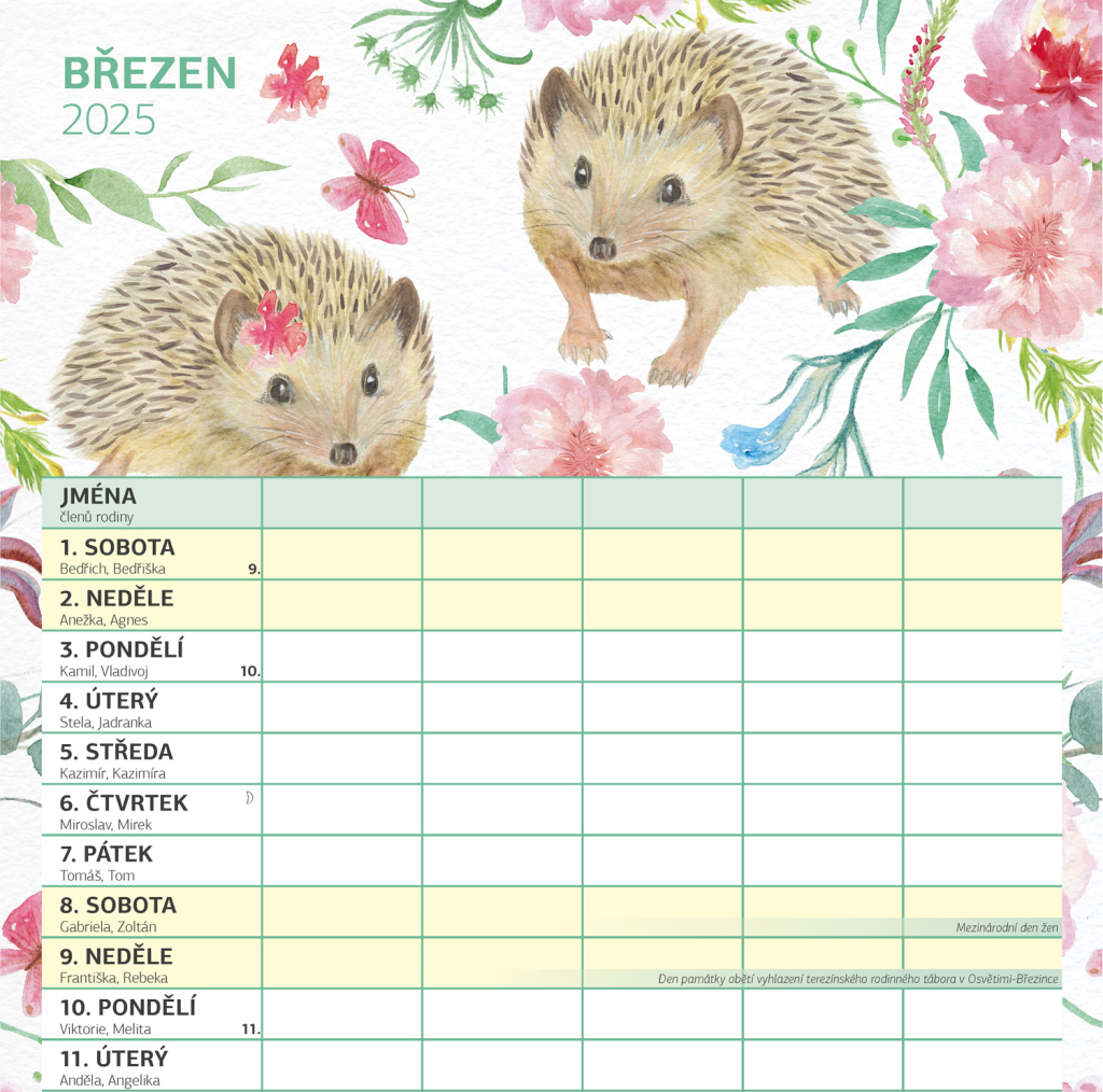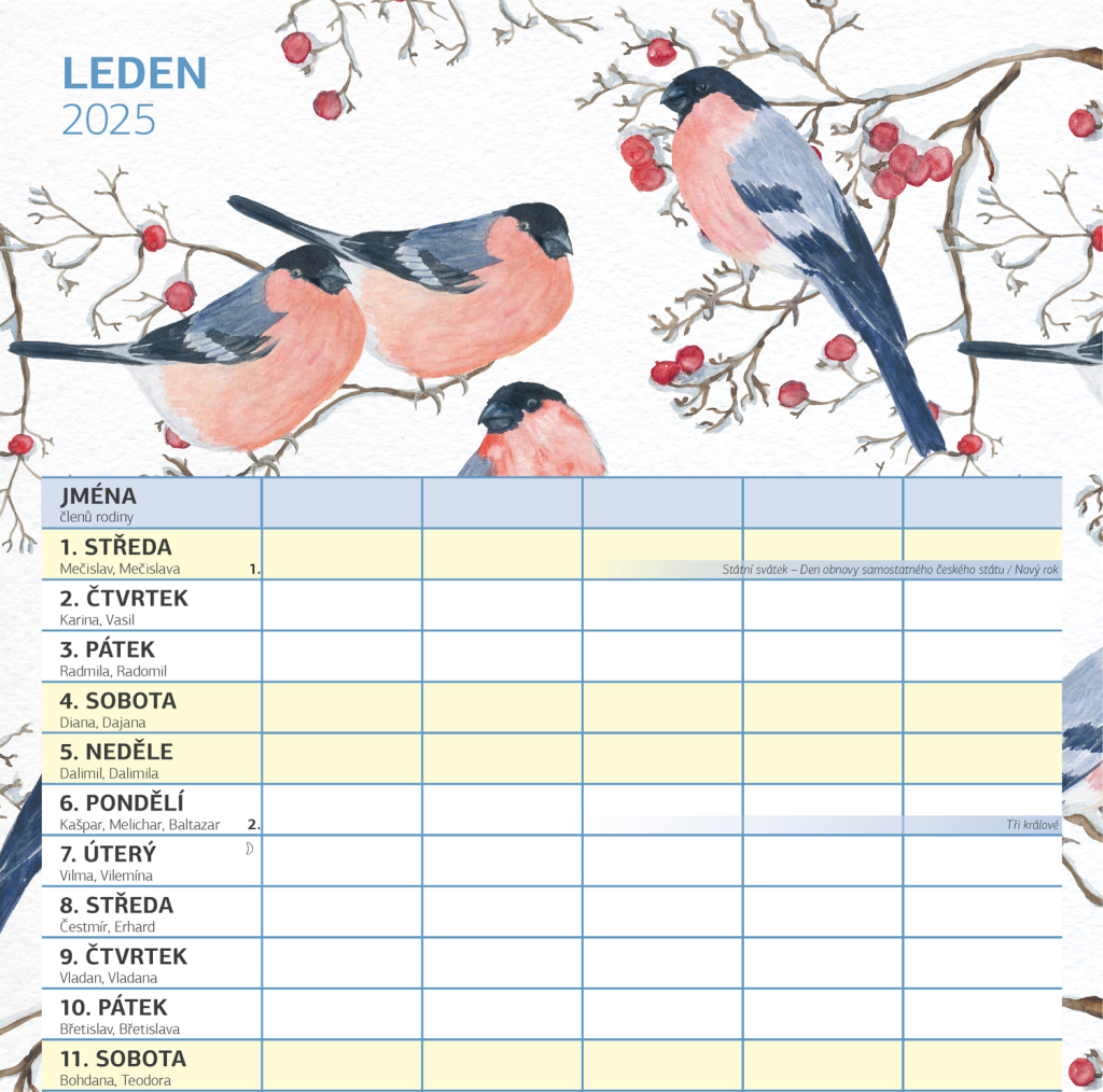 Zorganizujte všechny rodinné aktivity v praktickém nástěnném kalendáři, který obsahuje české kalendárium a samostatný plánovač aktivit pro až pět členů domácnosti. Kalendář doplňují veselé ilustrace s rodinnými motivy pro každé roční období.