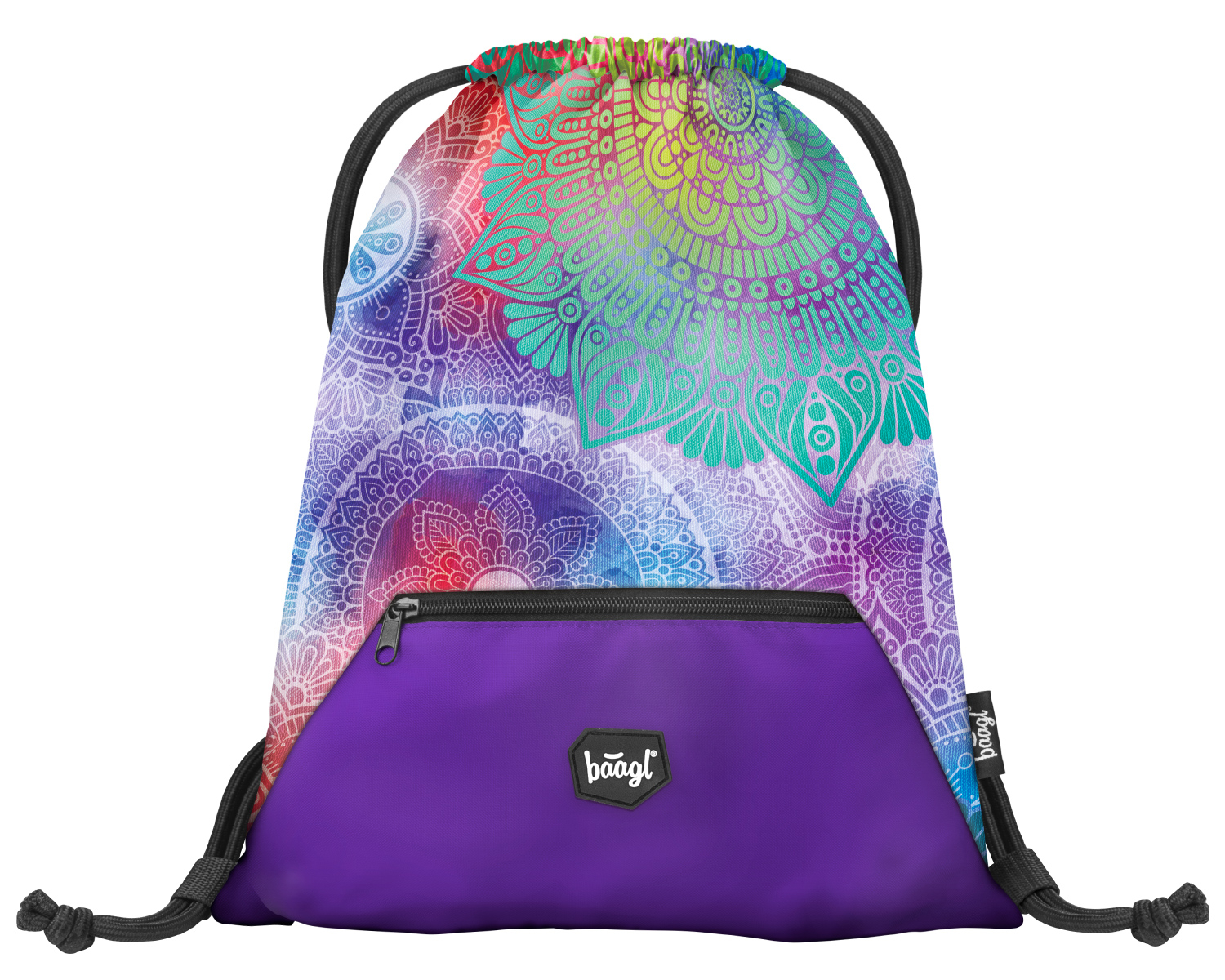 Sáček na cvičky nebo přezůvky s potiskem mandal ve fialovo-růžovém barevném provedení. • Sáček na cvičky nebo přezůvky s potiskem mandal. • Sáček je vyroben z pevného omyvatelného materiálu a v jeho dolní části je umístěna praktická kapsa na zip. • Zdrhování pomocí pevných tkanic, které zároveň umožňují nošení na zádech.