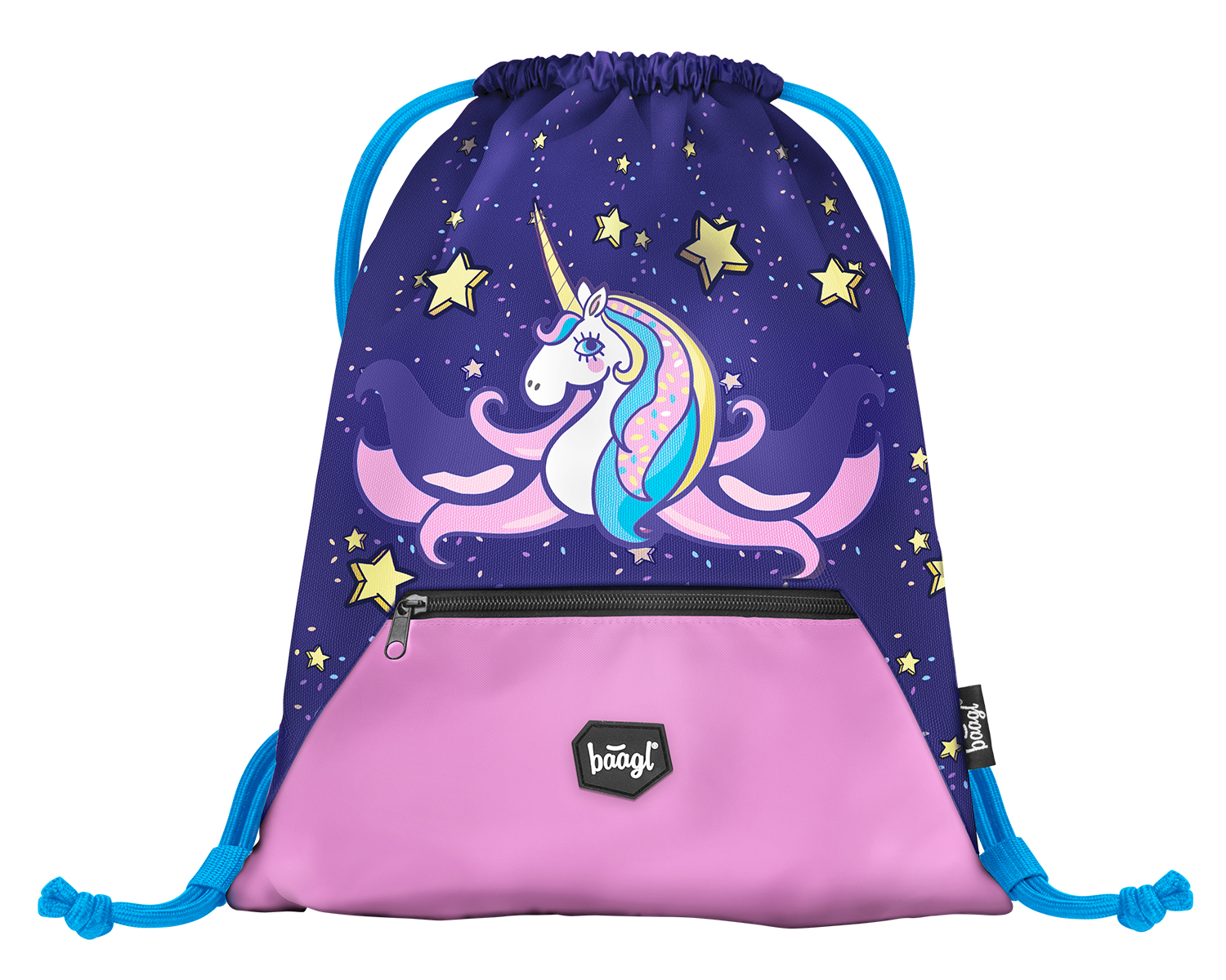 Sáček na cvičky nebo přezůvky ve fialové barvě a s obrázkem populárního jednorožce.