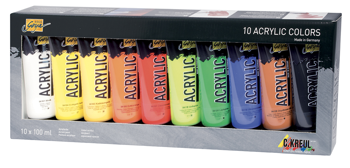 Sada Solo Goya 10 barev obsahuje: 10 x akrylová barva SOLO GOYA 100 ml (bílá, světle žlutá, kadmium žlutá, světle oranžová, listová zelená, ultramarínová modrá, rumělková, žlutozelená, hnědá, černá)