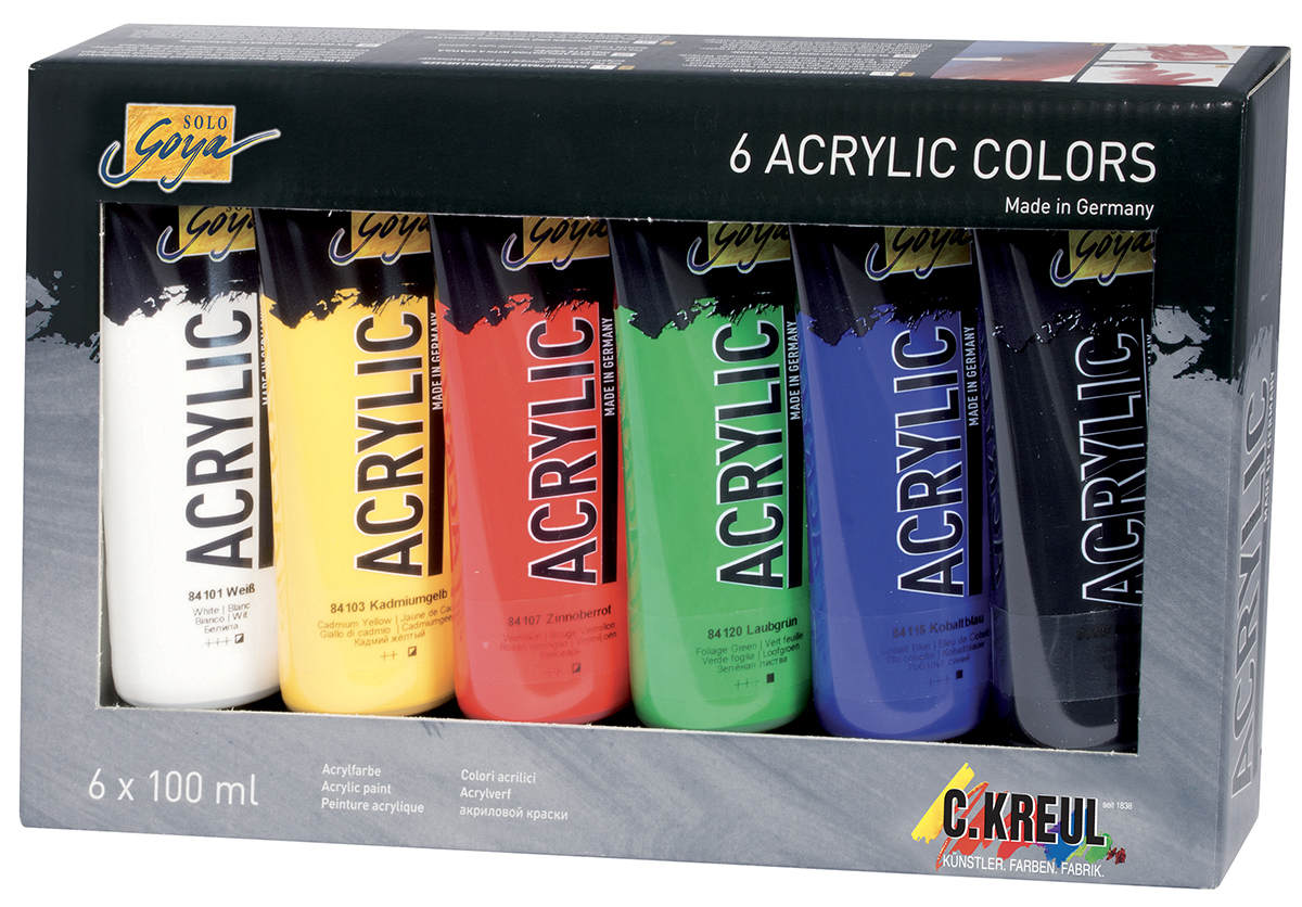 Sada Solo Goya 6 barev obsahuje: 6 x akrylová barva SOLO GOYA 100 ml (bílá, kadmium žlutá, listová zelená, kobaltová modrá, rumělková, černá)