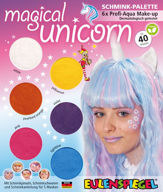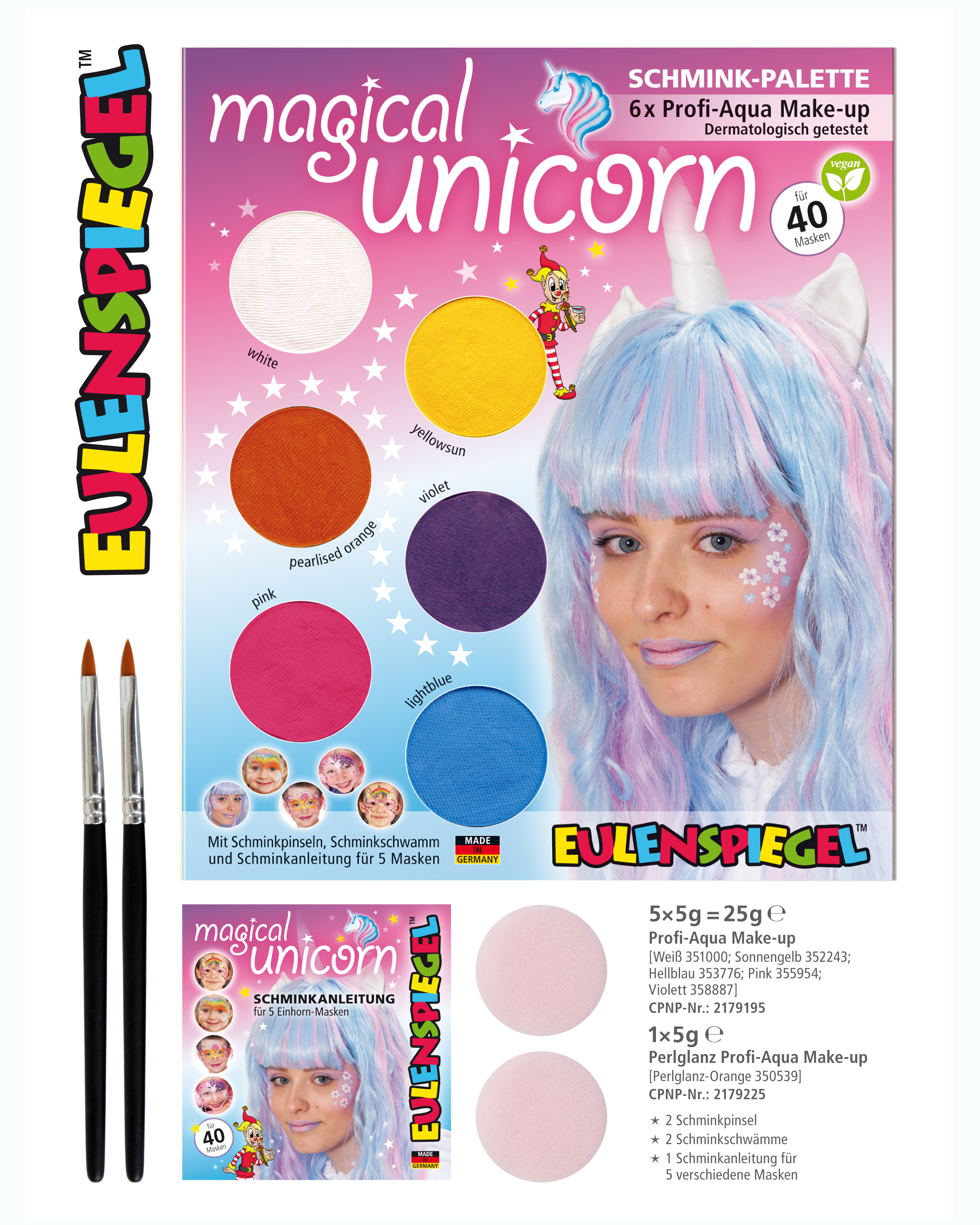 Paleta 6 barev vystačí na přibližně 60 masek. Paletka se skládá ze šesti barev Eulenspiegel (každá 3,5 ml), 2 štětců, 2 houbiček na make-up a kompletního návodu krok za krokem pro příslušné motivy. Paleta obsahuje barvy bílá, slunečně žlutá, perleťově oranžová, fialová, růžová, světle modrá. S našimi novými paletkami s bezplastovým vnějším obalem jsme snížili podíl plastu v celém produktu o 70 % (ve srovnání s našimi 6-baleními make-up paletami). Pouze nádoby na barvy Eulenspiegel jsou stále vyrobeny z recyklovatelného PS. Vnější obal je vyroben z recyklovaného kartonu.