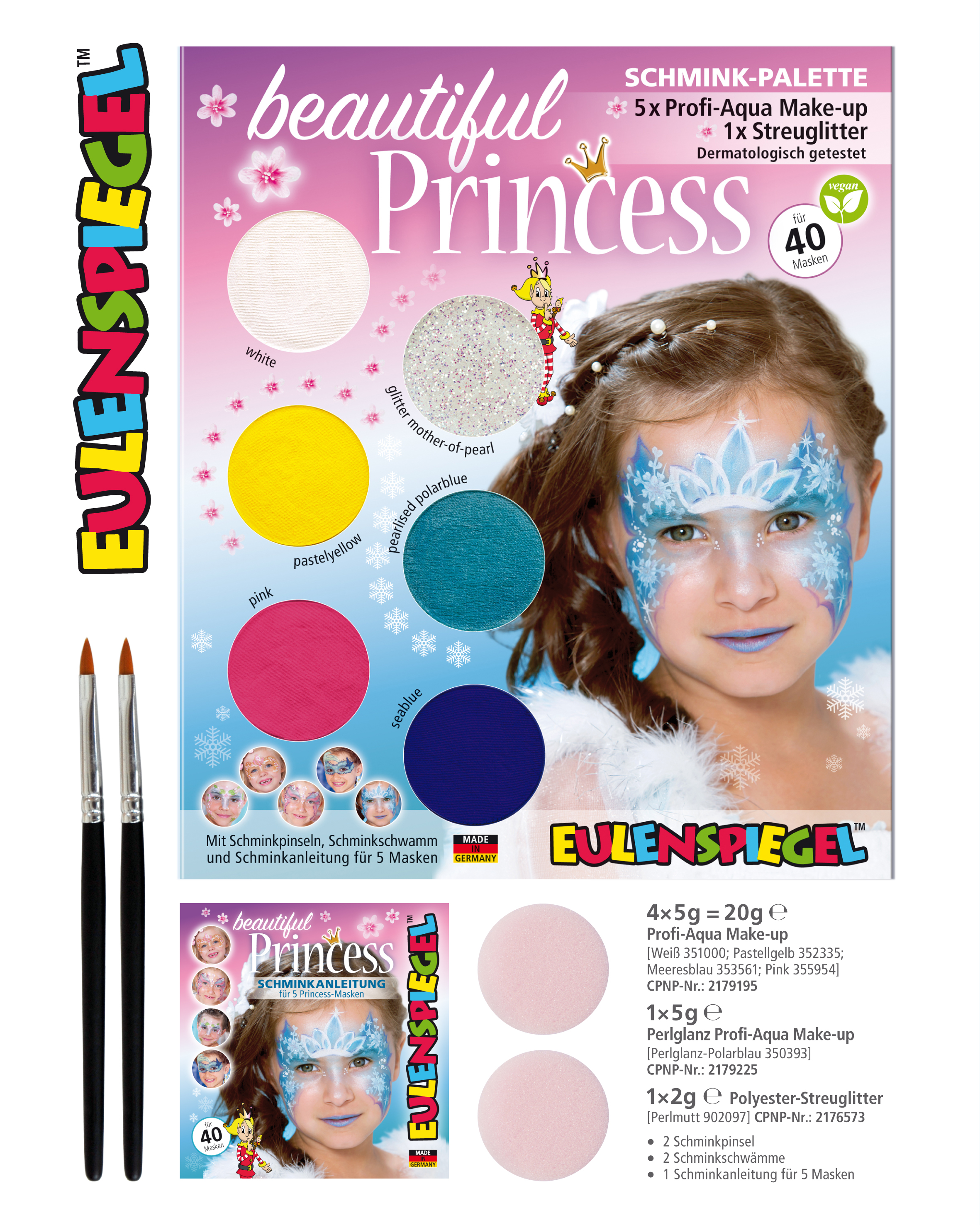 Paletka se skládá z pěti barev Eulenspiegel (3,5 ml každá) a jedné třpytky (2 g každá), 2 štětců, 2 houbiček na make-up a kompletního návodu krok za krokem k příslušným motivům.