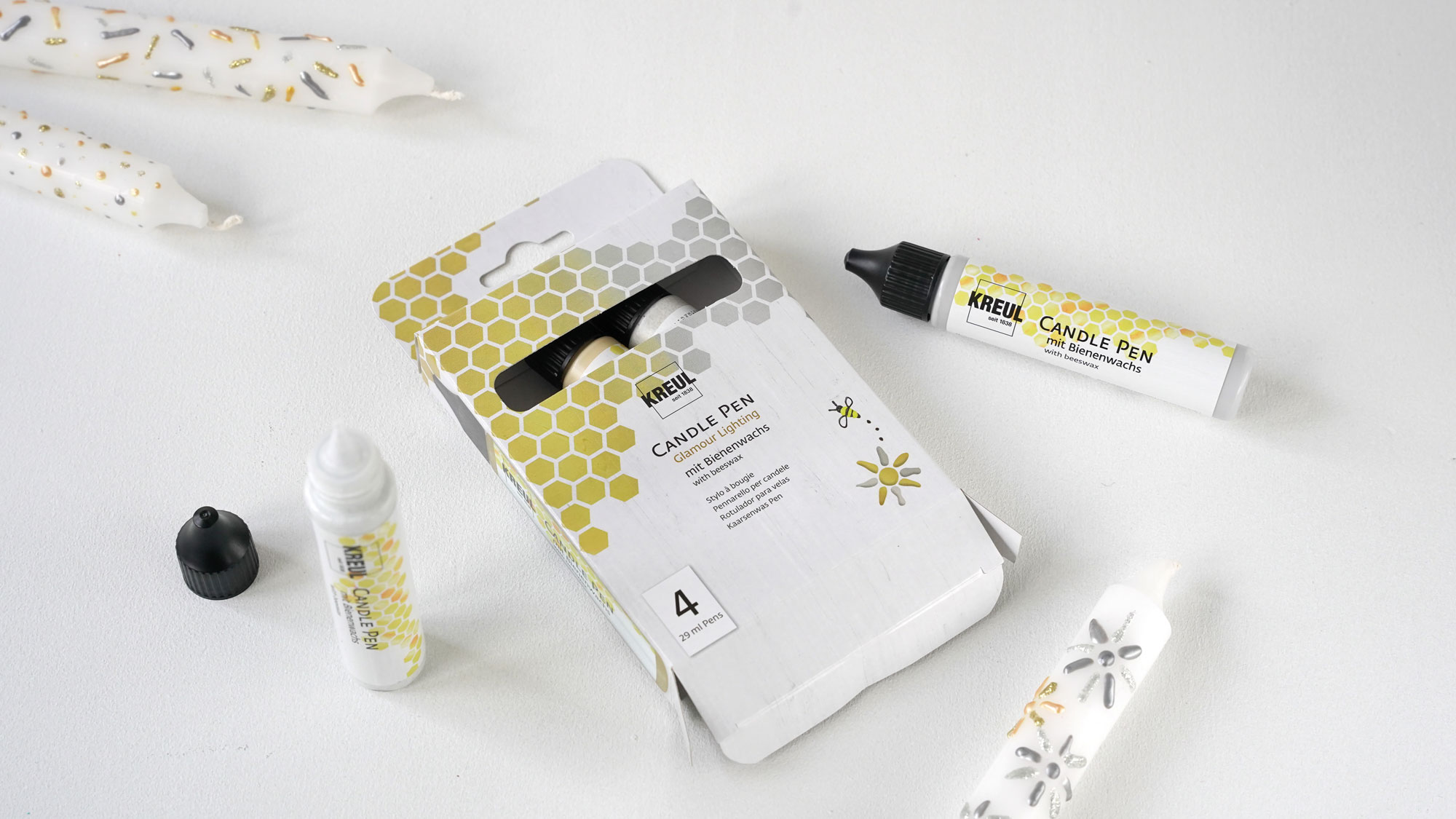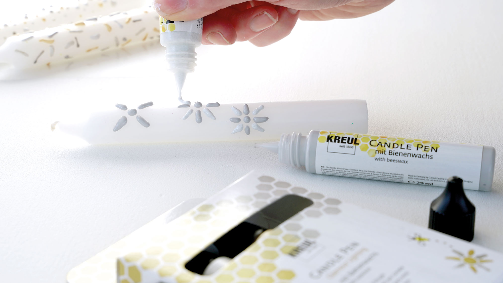 Zdobení svíček pomocí per na svíčky KREUL je snadné a přináší radost. Stačí začít a vytvářet elegantní vzory pomocí tupování, šablonování a malování. Pero je ideální pro vytvoření útulné atmosféry u vás doma. Barva na svíčky se vyrábí poctivě a bezpečně v Německu.