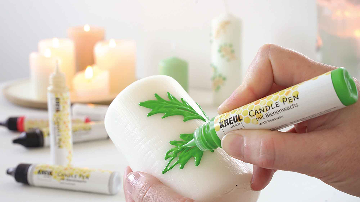 Zdobení svíček pomocí per na svíčky KREUL je snadné a přináší radost. Stačí začít a vytvářet elegantní vzory pomocí tupování, šablonování a malování. Pero je ideální pro vytvoření útulné atmosféry u vás doma. Barva na svíčky se vyrábí poctivě a bezpečně v Německu.