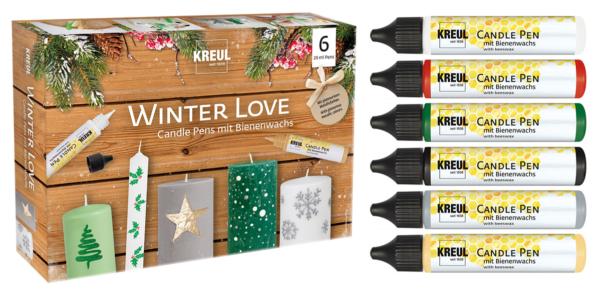 Kouzelná krajina venku, útulná atmosféra uvnitř - zima je prostě kouzelná. Oslavme ji se sadou 6 svíček KREUL Winter Love. Směs chladných a hřejivých barev lze použít k malování svíček a vytvořit tak poutavé zimní dekorace. Fantastický způsob, jak vytvořit stylovou atmosféru během chvilky, protože díky praktickému peru se barvy na svíčky používají velmi snadno. Zima je výjimečné období - užijme si ho při svíčkách.