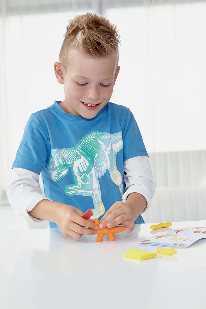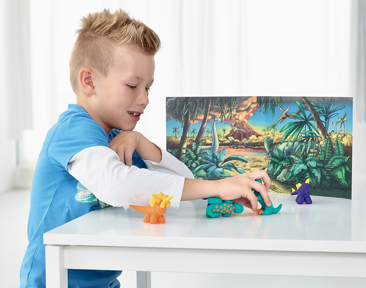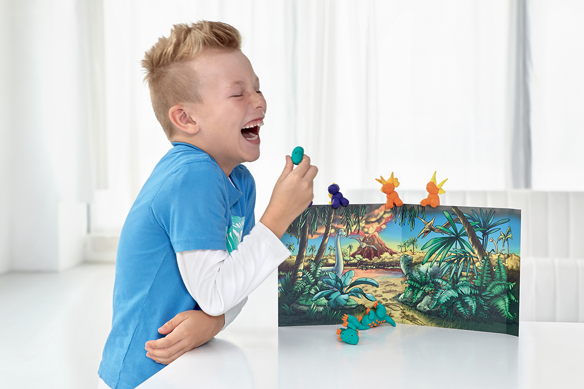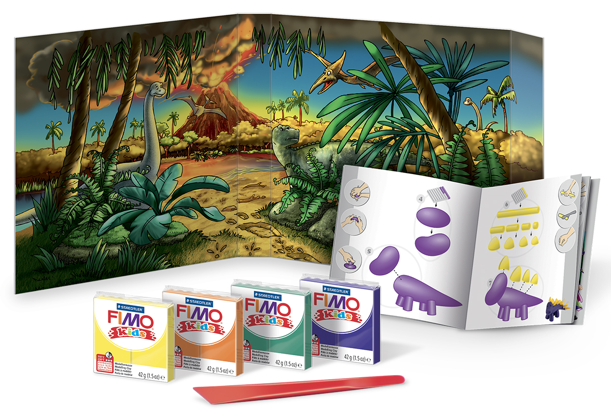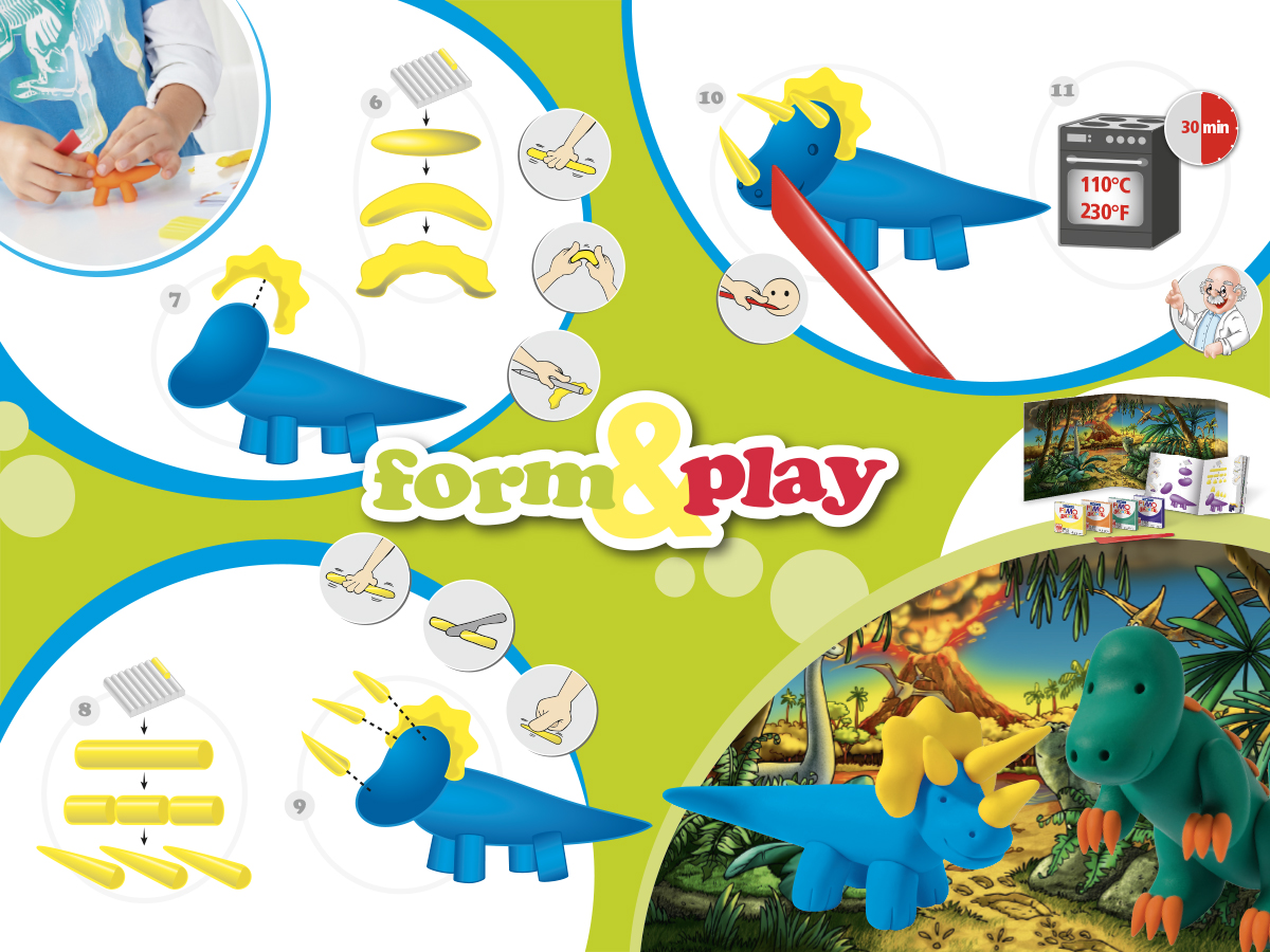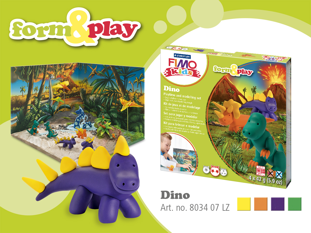 Se sadami FIMO kids "form & play" mohou děti vytvářet různé tematické světy podle detailních a dětem srozumitelných pokynů a vytvořit si tak svůj vlastní příběh ve světě her, který si vlastnoručně vyrobily. Bez ohledu na množství zkušeností s modelováním, které děti mají, si každé může vybrat svou úroveň obtížnosti (1=snadné, 2=středně obtížné, 3=obtížné) a dostane detailní, srozumitelný návod jak postupovat krok za krokem s množstvím obrázků. Obrázky odpovídají obtížnosti dané sady. Každá sada obsahuje čtyři balení FIMO Kids, pozadí, které se hodí k danému tématu, modelovací nástroj a brožurku s návodem. Tyto "zelené"sady jsou mezi dětmi nejoblíběnější ze všech produktů z řady FIMO kids a jsou velmi vhodné jako dárek.