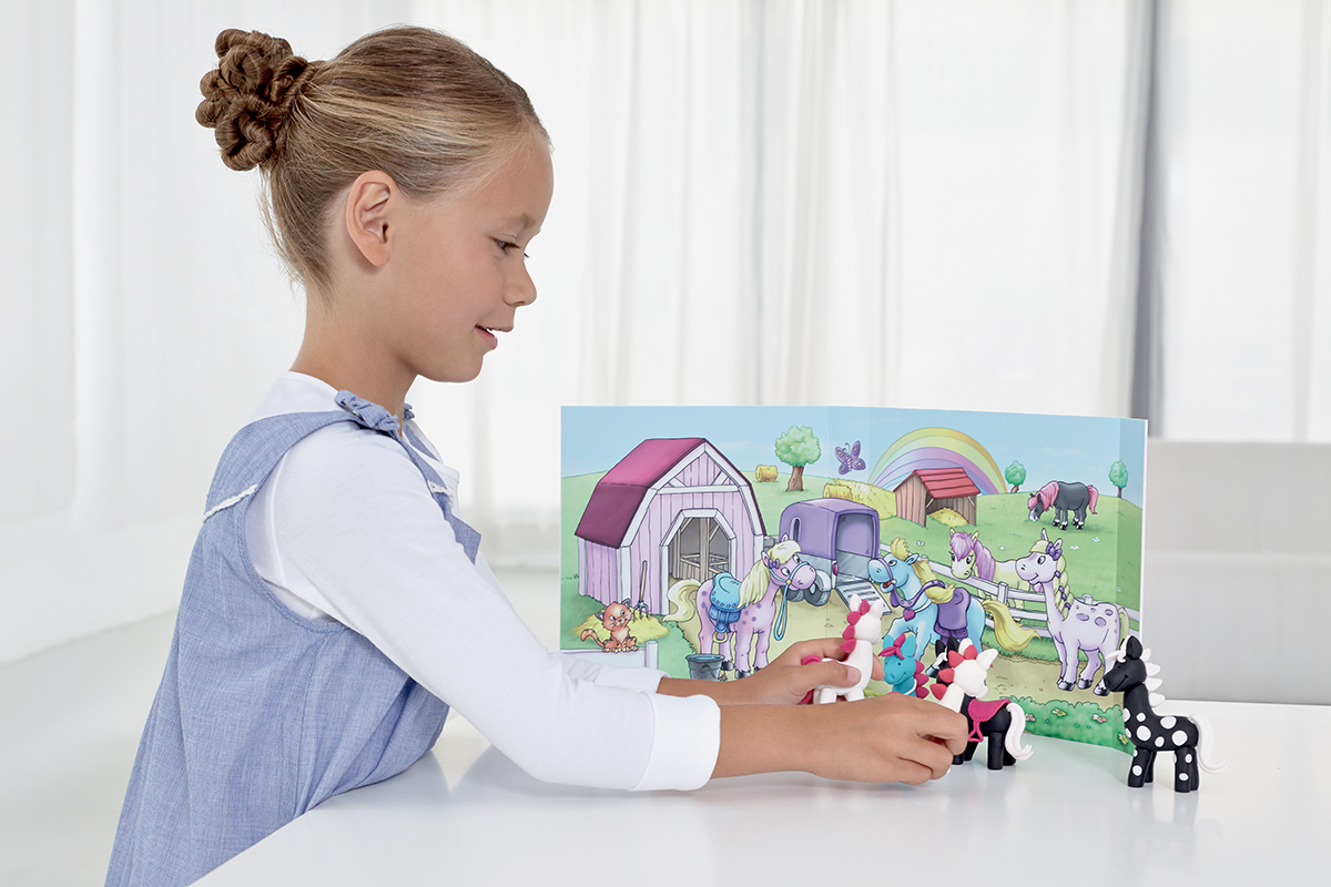 Se sadami FIMO kids "form & play" mohou děti vytvářet různé tematické světy podle detailních a dětem srozumitelných pokynů a vytvořit si tak svůj vlastní příběh ve světě her, který si vlastnoručně vyrobily. Bez ohledu na množství zkušeností s modelováním, které děti mají, si každé může vybrat svou úroveň obtížnosti (1=snadné, 2=středně obtížné, 3=obtížné) a dostane detailní, srozumitelný návod jak postupovat krok za krokem s množstvím obrázků. Obrázky odpovídají obtížnosti dané sady. Každá sada obsahuje čtyři balení FIMO Kids, pozadí, které se hodí k danému tématu, modelovací nástroj a brožurku s návodem. Tyto "zelené"sady jsou mezi dětmi nejoblíběnější ze všech produktů z řady FIMO kids a jsou velmi vhodné jako dárek.