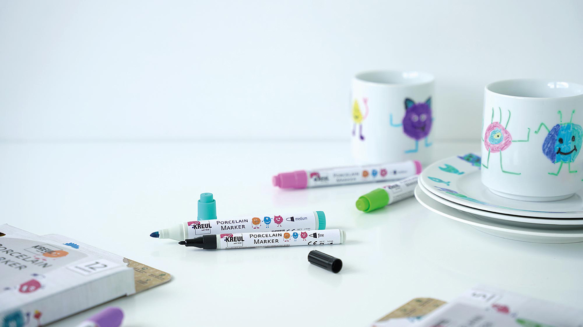 S touto sadou můžou děti od 6 let zdobit šálky, talíře, hrnečky, misky a další věci z porcelánu. Velká sada obsahuje fixy ve 12 barvách. Snadno se používají, fungují bez nutnosti popisovač nejprve protřepat nebo napumpovat. Složení barev je veganské a bylo dermatologicky testováno.