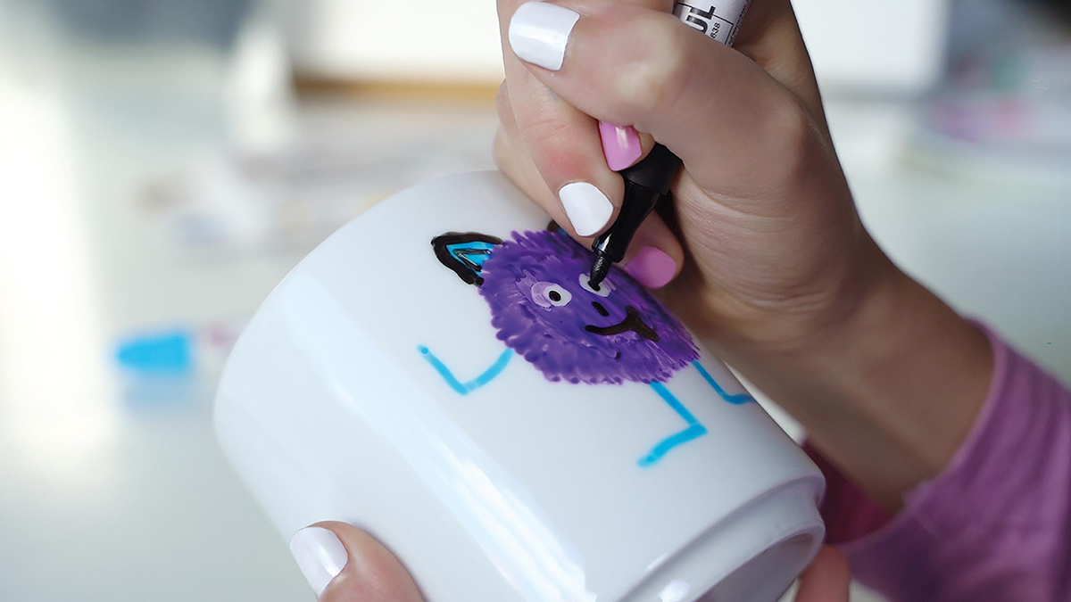 Jak na to: Nekreslete na místa, která přicházejí do styku s jídlem nebo pitím. Pokud barva nebyla vypálena, můžete ji odstranit vodou. Nechte zaschnout 4 hodiny, vložte hrnek do studené domácí trouby a zafixujte barvy při teplotě 160 °C po dobu 90 minut. Hrnek nechte vychladnout a barvy v troubě ztuhnout. Design je pak možné mýt v myčce nádobí.