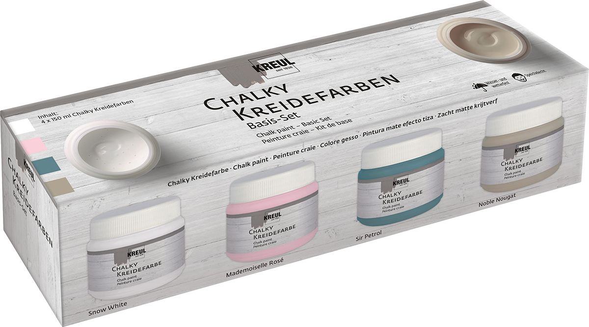 Při pohledu na stylové dekorační křídové barvy CHALKY PAINT vás ovládnou vzpomínky a touha po dokonalé nedokonalosti. S Kreul křídovými barvami CHALKY PAINT nové předměty ,,zestárnou“ a staré předměty získají nový nátěr, který vyzdvihne jejich historii. Oblíbené severské tóny jemně uzavřou prostor a vytvoří příjemnou atmosféru. Vintage barevný tón umožní odhalit přitažlivost nedokonalosti. Přidejte dotek půvabu s Kreul akrylovými metalickými barvami a vytvořte ušlechtilé předměty na výzdobu svého domova.