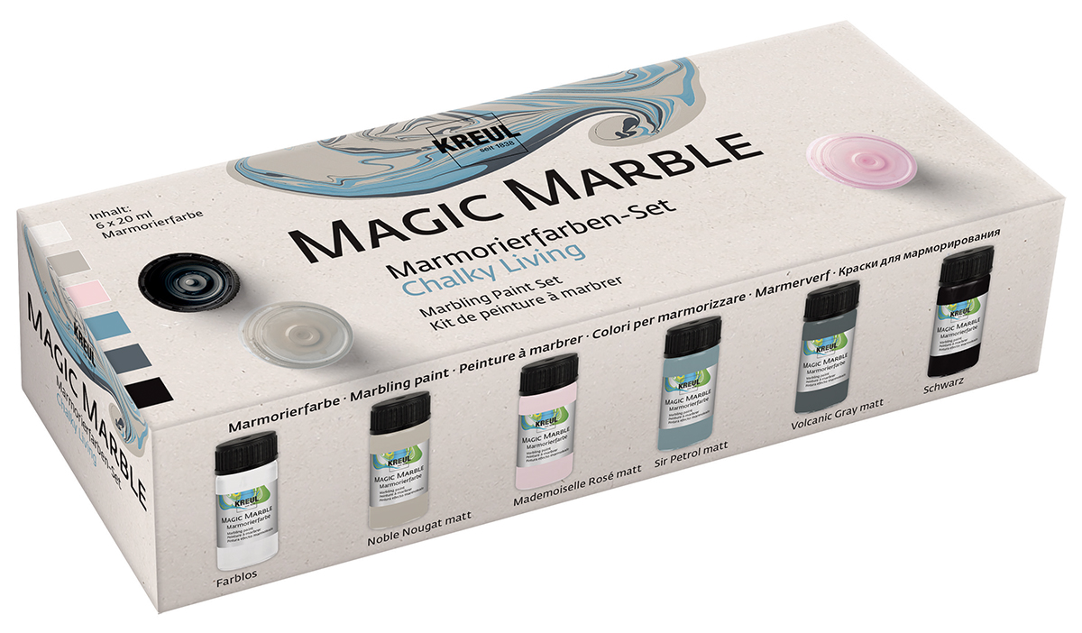 Setkali jste se už někdy s mramorováním? Tato technika je velice jednoduchá a tak můžete lehce tvořit i s vašimi dětmi. S mramorovacími barvami Kreul vytvoříte krásné dekorace, ať už mramorovaná velikonoční vajíčka, vánoční ozdoby, svíčky nebo cokoliv dalšího, co vás napadne. Mramorovat tak můžete např. pohlednice, porcelánové hrnečky, keramiku, skleněné dekorace či výrobky ze dřeva. Zkrátka, kdykoliv potřebujete vytvořit neobvyklý a neopakovatelný vzor, mramorování nabízí netušené možnosti.