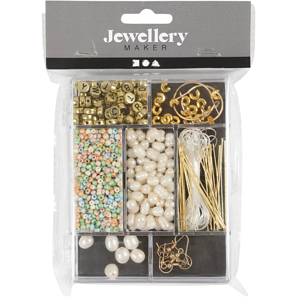 Sada obsahuje: rokajlové perličky, písmenkové korálky, tvarované dřevěné korálky, špendlíky, francouzský náušnicový drát a elastickou bižuterní gumu. Ale to není vše - každá sada také obsahuje návody, které vám pomohou vyrobit si vlastní náhrdelník, náramek nebo náušnice.