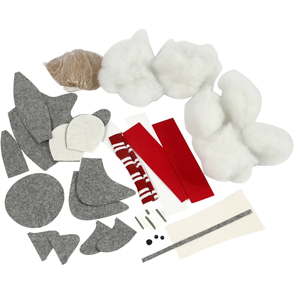 Obsah: Předstřižené díly z šedé, červené a smetanové plsti, 2 černé dřevěné korálky, polyesterová výplň, kousky kartonu na výrobu dárku, pletená šála a nit. Návod je součástí balení.