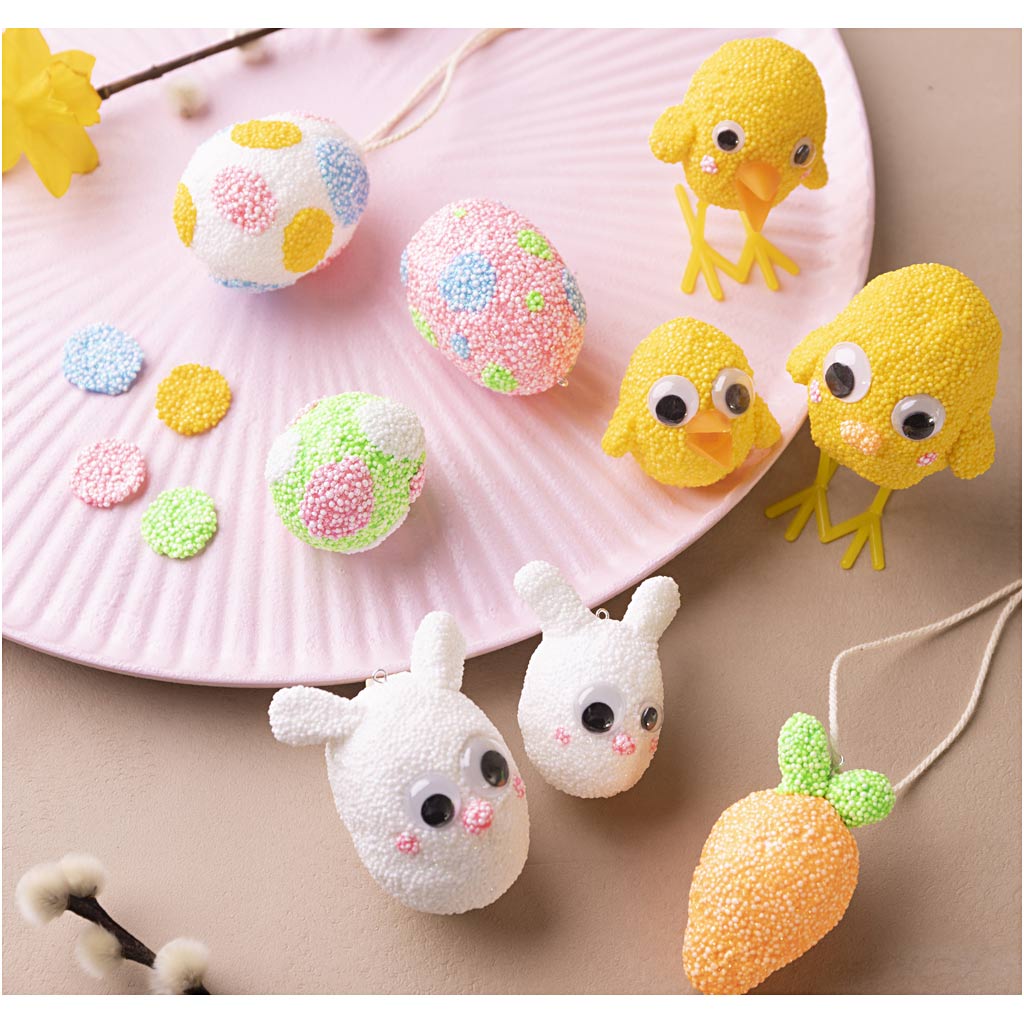 Pokud si chcete vytvarovat vlastní velikonoční figurky, naše sada je ideální. Obsahuje vše, co potřebujete, abyste mohli začít. Pomocí samotvrdnoucí pěnové hmoty Foam Clay pokryjte polystyrenová vajíčka a vytvořte si různé vzhledy pomocí dodaných očí, zobáčku a nohou. Figurky můžete vymodelovat podle vlastní fantazie nebo můžete použít návod na zadní straně. Návod najdete také online naskenováním QR kódu na krabici.