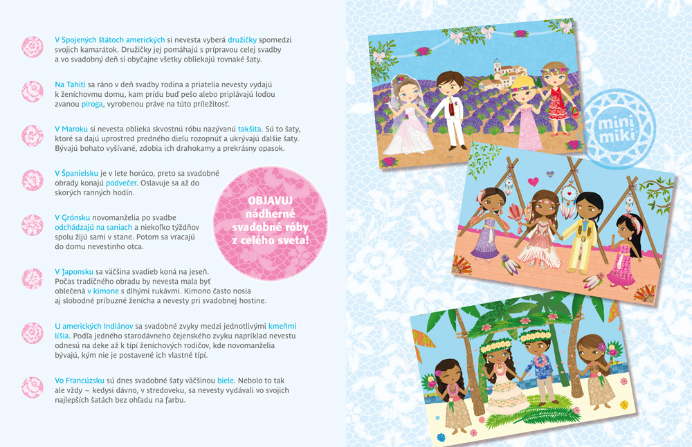 Knížky z kolekce minimiky patří dlouhodobě k našim nejprodávanějším. Představují tím úplně nejjednodušším a zároveň hravým způsobem módu a něco z kultury cizích zemí. Děti díky nim poodhalí každodenní život lidí z nejrůznějších koutů světa, jejich zvyky nebo navštíví zajímavá místa. Díky tomu získají a zpřesní si své představy o cizí zemi, jejích obyvatelích, folklóru či módě. Více než 300 překrásných barevných samolepek, atraktivní obrázky a dvojjazyčné texty učiní jejich poznávání ještě zajímavějším a komplexnějším.