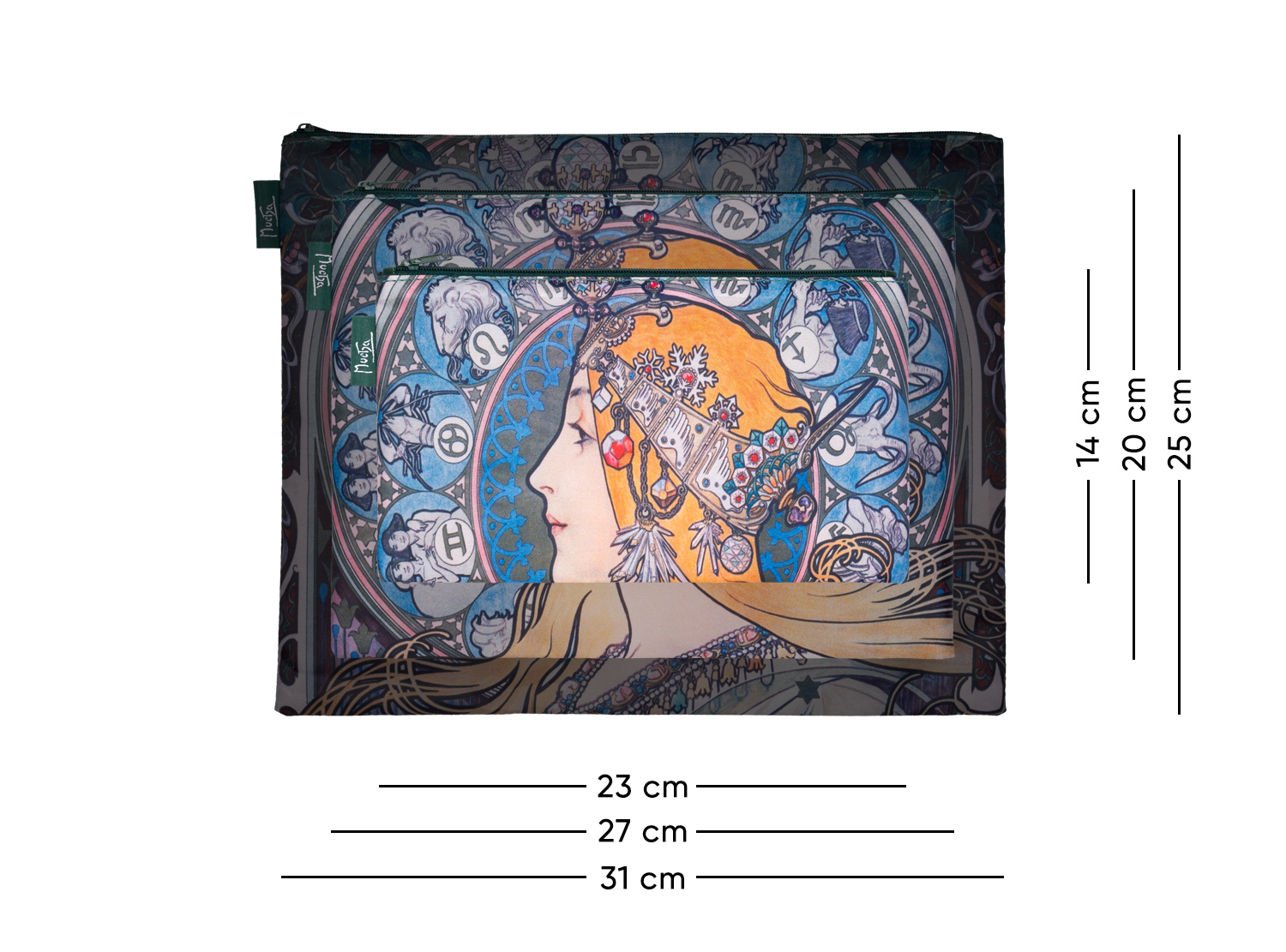Praktický set 3 stylových taštiček na zip ve třech velikostech - ideální společník pro cestování. Kam uklidit kartáček, zubní pastu nebo rtěnku? Jak v kufru oddělit ponožky a spodní prádlo? Mít hned po ruce doklady a další potřebné dokumenty? Máme pro vás skvělé řešení! Díky těmto praktickým a stylovým taštičkám na zip ve třech velikostech máte vše pohodlně a rychle po ruce. Navíc jsou v trendy motivech. Taštičky jsou potištěná dekorem klasika českého malířství Alfonse Muchy. Cestujte s radostí a bez stresu! Mějte své zavazadlo pod kontrolou. Rozměr: MINI – 13 x 23 cm, MIDI 20 x 27 cm, MAXI 25 x 32 cm