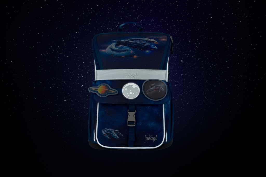 Lehká školní aktovka s motivem vesmírné lodi a posuvným zádovým systémem je ideální pro děti od 1. třídy.