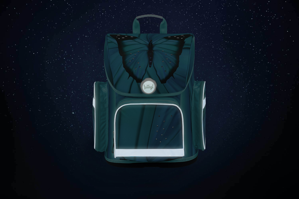 Školní aktovka Ergo Butterfly ve výrazné tyrkysové barvě, doplněný o obrázky motýlků. Aktovka vhodná pro 1. - 2. třídu základní školy.