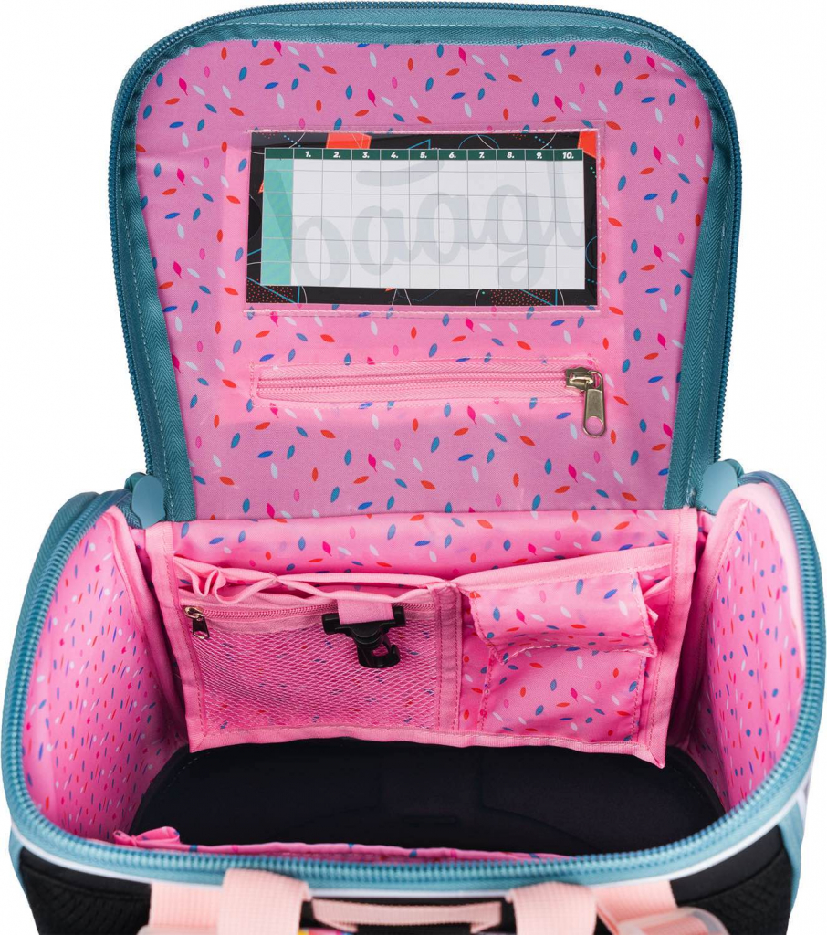 • Uvnitř aktovky je průhledná kapsa s rozvrhem a vnitřní organizér umožňující rovnoměrné rozložení hmotnosti, doplněný gumičkou pro fixaci.
