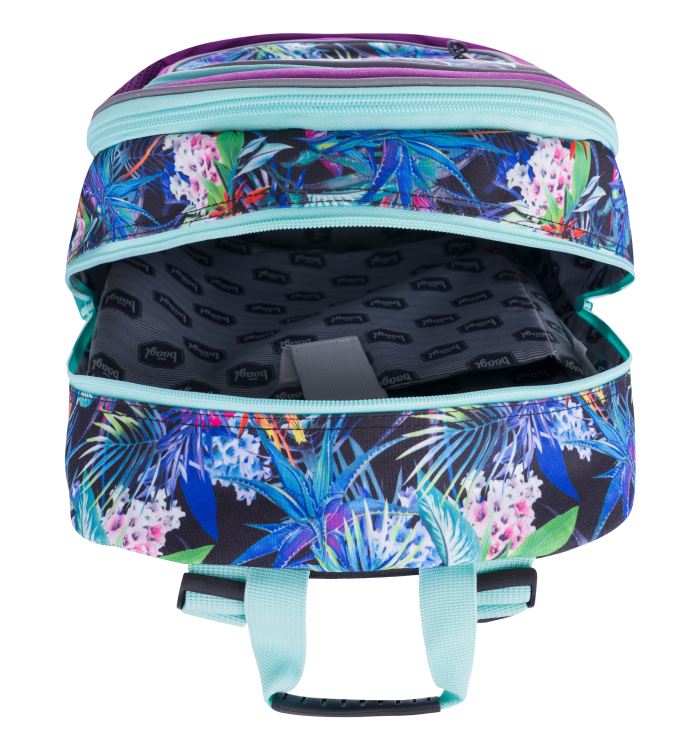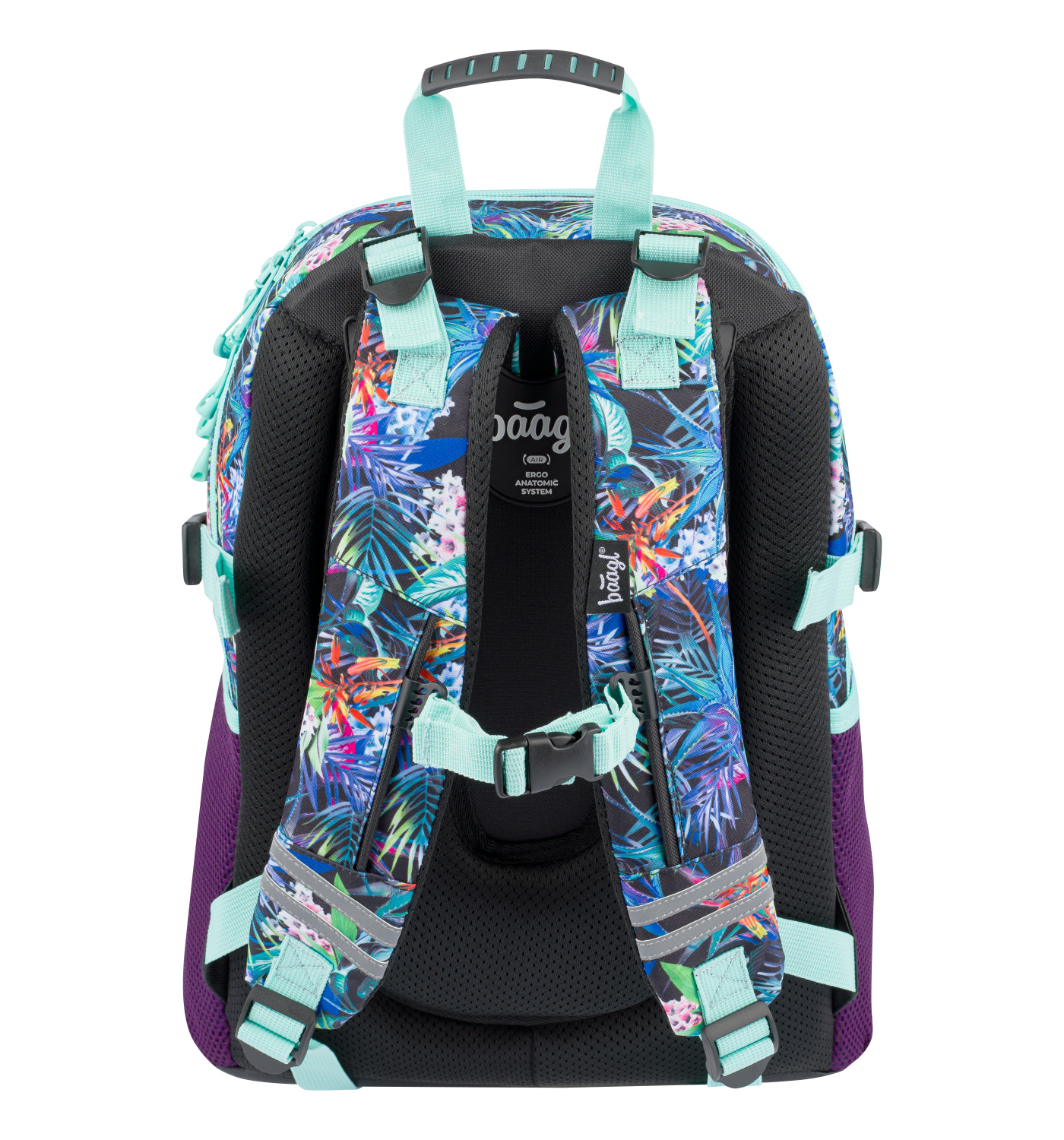 Dívčí batoh Jungle v modro-fialové barvě s tropickým motivem potisku. Batoh je vhodný od 3. třídy základní školy. • Ergonomický školní batoh se třemi samostatně uzavíratelnými komorami s vnitřním organizérem a kapsou na 15palcový notebook či tablet. • Ergonomicky tvarovaná záda, plně nastavitelné ramenní, prsní a boční kompresní popruhy pro optimální přizpůsobení postavě. • Boční kapsy z pevné síťoviny na láhev na pití či jiné drobnosti. • Velmi nízká hmotnost batohu – 820 g. • Objem batohu je 25 litrů, nosnost je 7 kg. • Batoh je vyrobený z pevného voděodolného materiálu. • Reflexní prvky pro bezpečnost dítěte. • Batoh je vybaven trendy chlupatým přívěskem. • Batohy z řady KLASIK byly testovány a certifikovány v akreditované zkušební laboratoři.