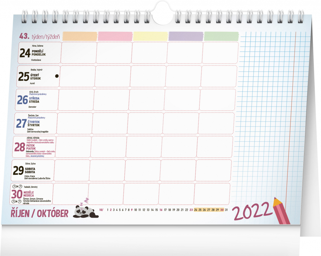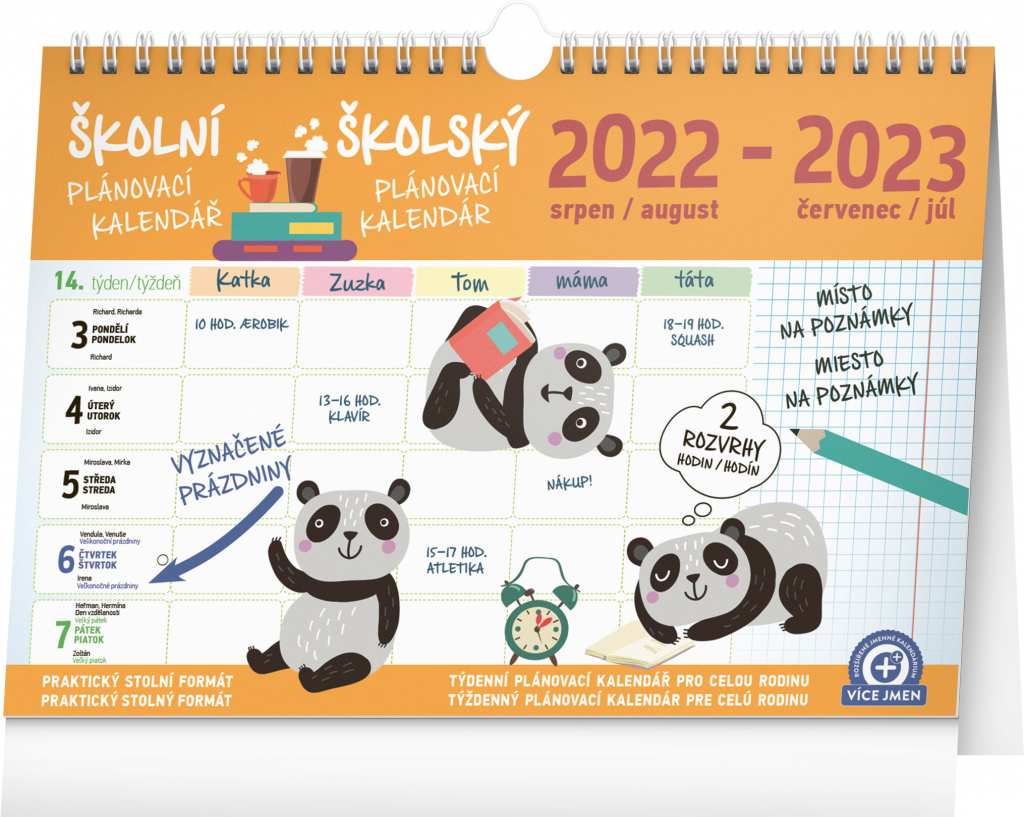 My všichni školou povinní víme, jak důležité je najít balanc mezi povinnostmi a zábavou. Čas si může naplánovat až pětičlenná rodina do sloupečků na celý týden. Obsahuje české a slovenské kalendárium od srpna 2022 do července 2023, tematické ilustrace a praktický háček k zavěšení.