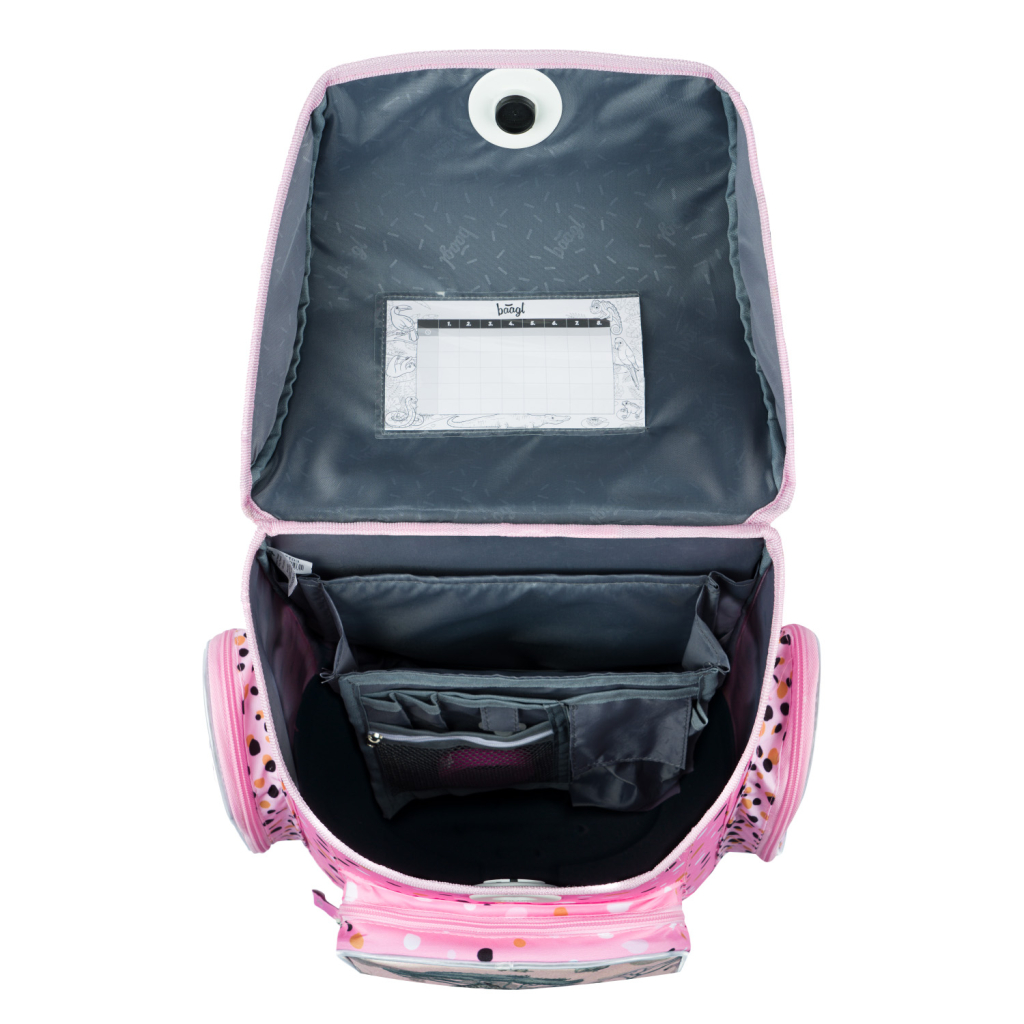 • Uvnitř aktovky je průhledná kapsa na rozvrh a vnitřní organizér umožňující rovnoměrné rozložení hmotnosti.