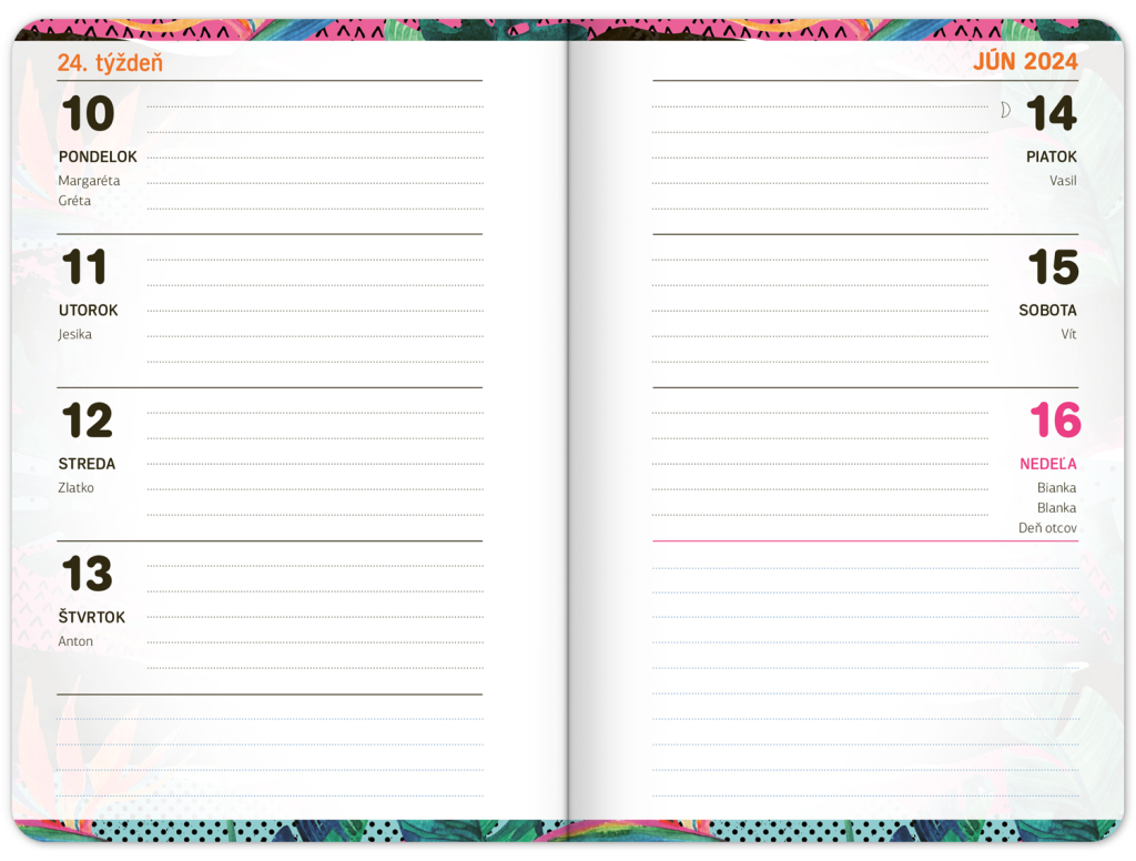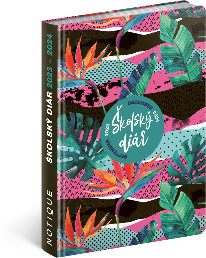 Školní diář se svěžím motivem obsahuje přehled na rok 2023 a 2024, české týdenní řádkové kalendárium se jmény a svátky, rozvrh hodin, prostor na poznámky. Kalendárium začíná v září 2023 a končí v prosinci 2024.
