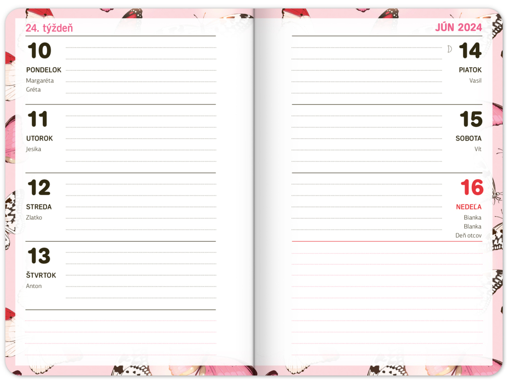 Školní diář s motivem motýlků v růžové barvě obsahuje přehled na rok 2023 a 2024, české týdenní řádkové kalendárium se jmény a svátky, rozvrh hodin, prostor na poznámky. Kalendárium začíná v září 2023 a končí v prosinci 2024.