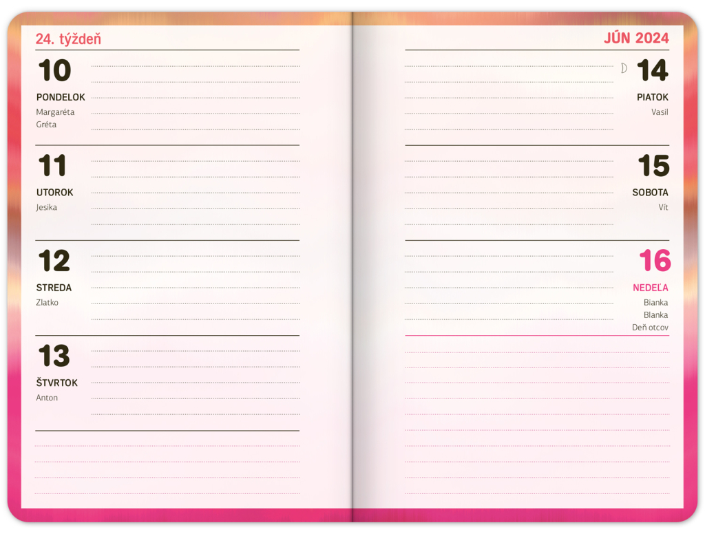 Školní diář s abstraktním motivem v růžové barvě obsahuje přehled na rok 2023 a 2024, české týdenní řádkové kalendárium se jmény a svátky, rozvrh hodin, prostor na poznámky. Kalendárium začíná v září 2023 a končí v prosinci 2024.