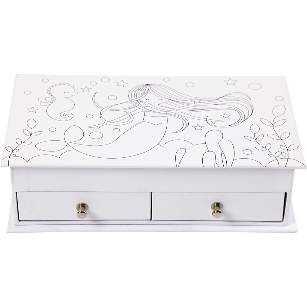 Šperkovnice z kartonu s potiskem mořské panny na víku. Šperkovnice se skládá ze 2 zásuvek ve spodní části, 6 přihrádek v horní části a zrcátka na zadní straně víka.