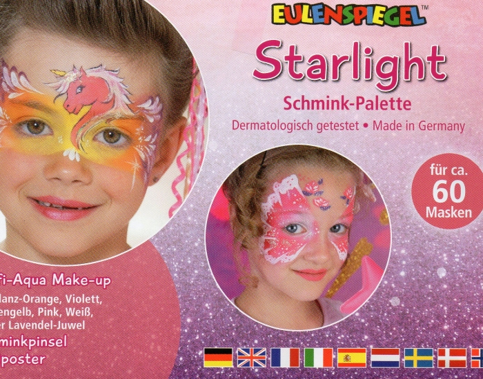 Sada profesionálních barev Eulenspiegel na obličej s motivem v plastové paletě, barvy jsou vysoce koncentrované a vydrží mnoho použití. Barvy jsou vodou ředitelné a splňují všechny nejpřísnější atesty EU. Po zaschnutí se barvy na dotek neotírají. Sada barev na obličej obsahuje: 5 x 3,5 ml barev - perleťová oranžová, fialová, sluneční žlutá, růžová, bílá a 1 x 2 g třpytky fialové, šteteček, návod krok za krokem