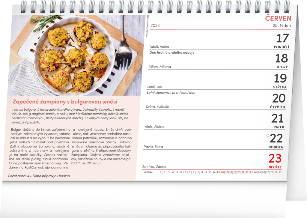 Pro všechny, kteří hledají inspiraci při vymýšlení nových jídel, je tu stolní kalendář nabitý těmi nejzajímavější recepty. Najdete zde 53 receptů, jejichž základem je poctivá domácí kuchyně, kterou vyznávaly už naše babičky. Týdenní stolní kalendář s českými jmény obsahuje také svátky, památné dny, fáze měsíce a přehled na celý rok 2024 a 2025.